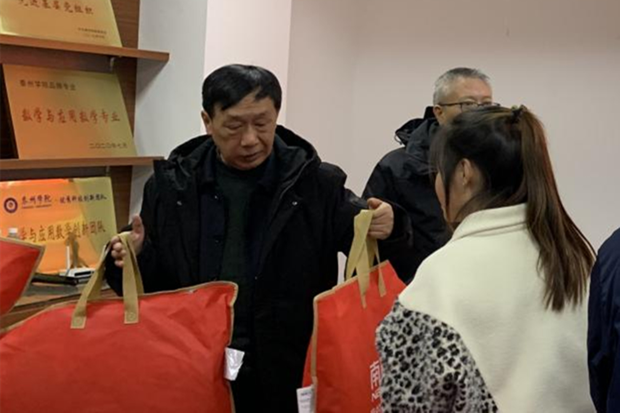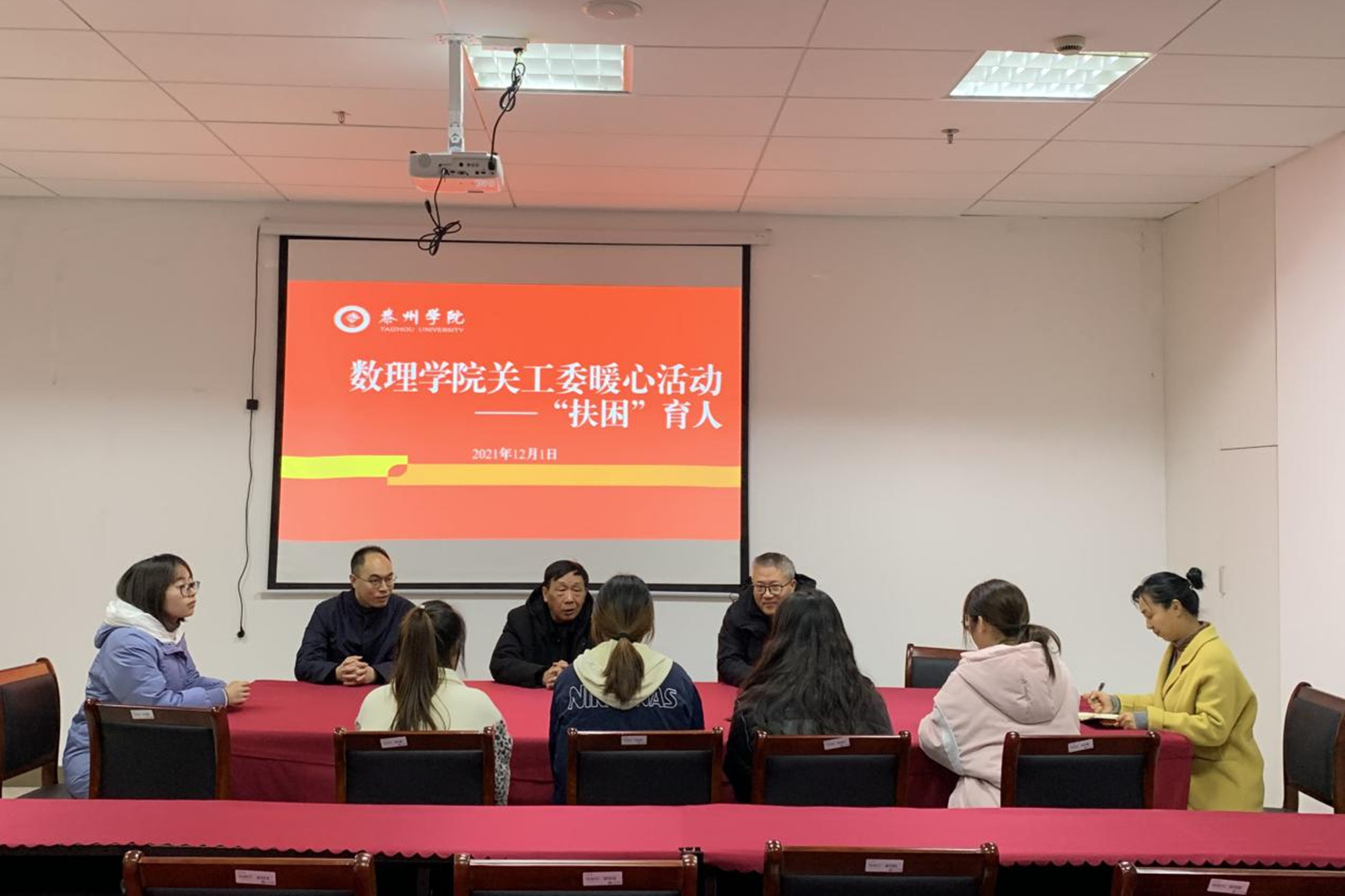 12月1日下午,数理学院关工委开展“‘扶困’育人”暖心活动,为困难学生送上学习用品、生活用品和防寒物资。校党委常委、副校长张曙光,学院党总支书记杨俊林,关工委主任吴小荣以及辅导员参加本次活动。