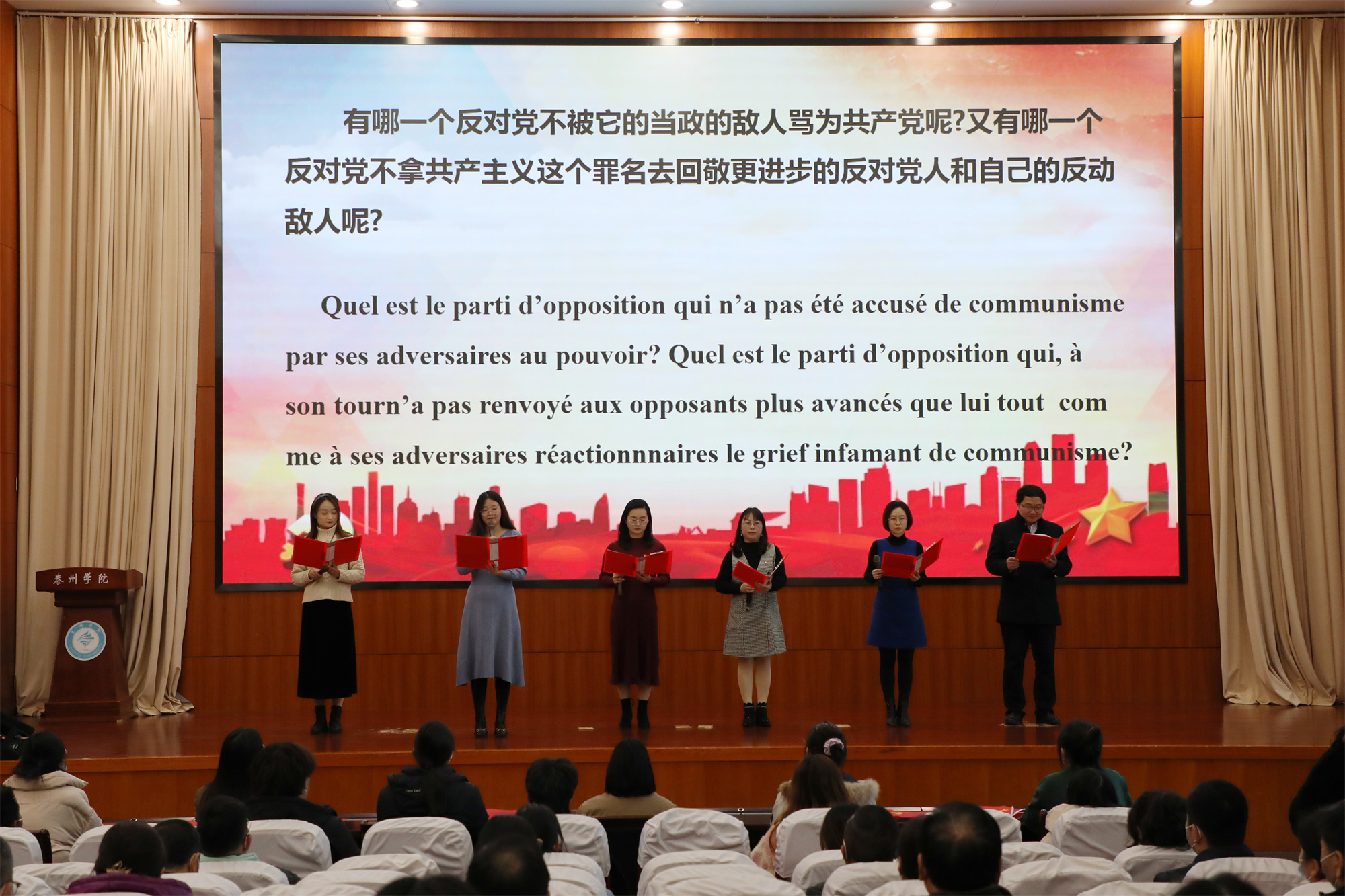 “真理的味道非常甜。”泰州市“金牌讲解员”乔默之生动讲述了100年前陈望道在翻译首个中文全译本《共产党宣言》的故事。泰州市外事办林阳扬、米兰官网李更春、王硕、肖婷、任扬、单蓓蕾等同志分别以中、英、法、德、日、朝鲜语等6种语言诵读《共产党宣言》节选内容,让大家感悟到了信仰的力量。