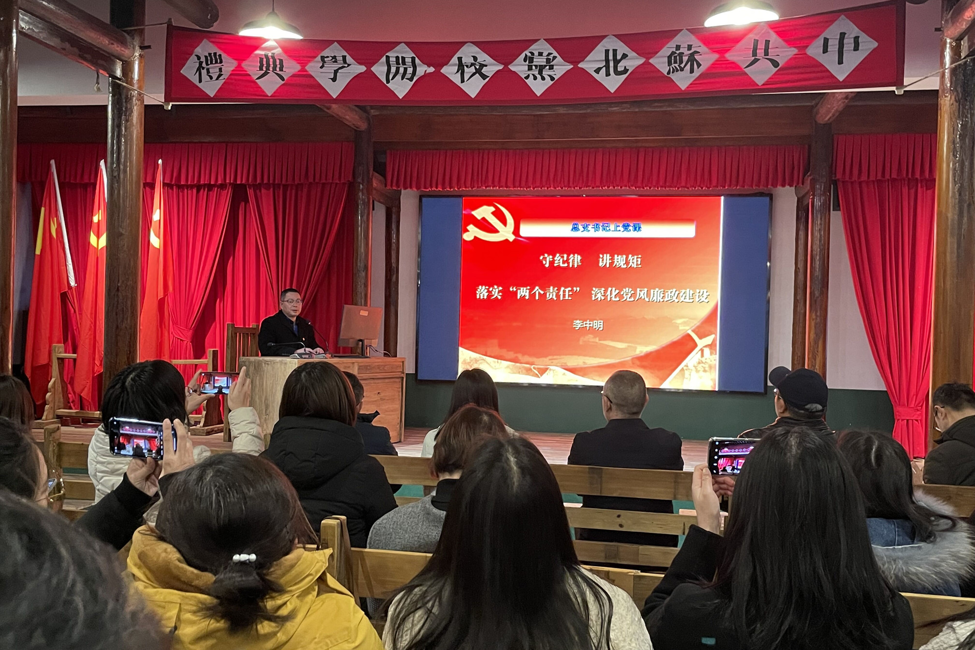 在苏北党校礼堂,学院党总支书记李中明和大家一起学习了党的十九届六中全会的精神,要求全体党员同志深刻把握六中全会精神的核心要义和实践要求。