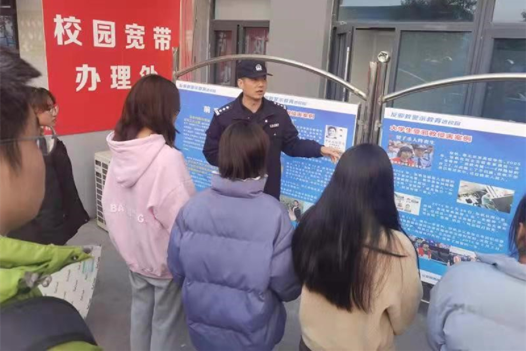 在宣传展板前,驻校民警程金星警官通过典型的案例分析了邪教违法犯罪活动的社会危害性,解读了国家防范和处理邪教相关政策和法律法规,教育同学们“反对邪教,从我做起,自觉做到不信、不传、不参与,坚决和邪教作斗争。”
