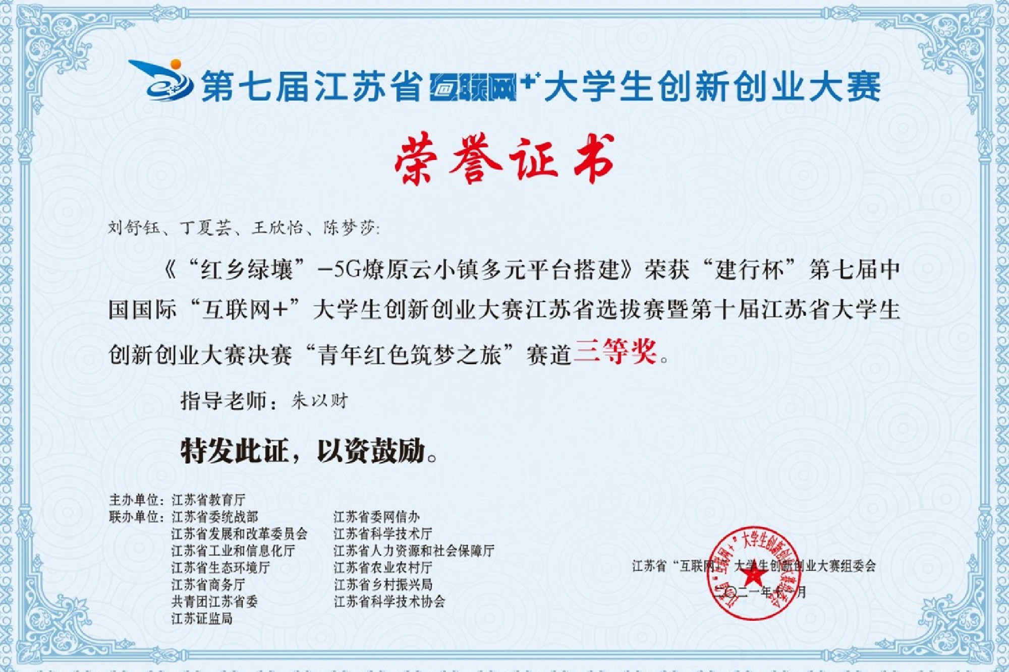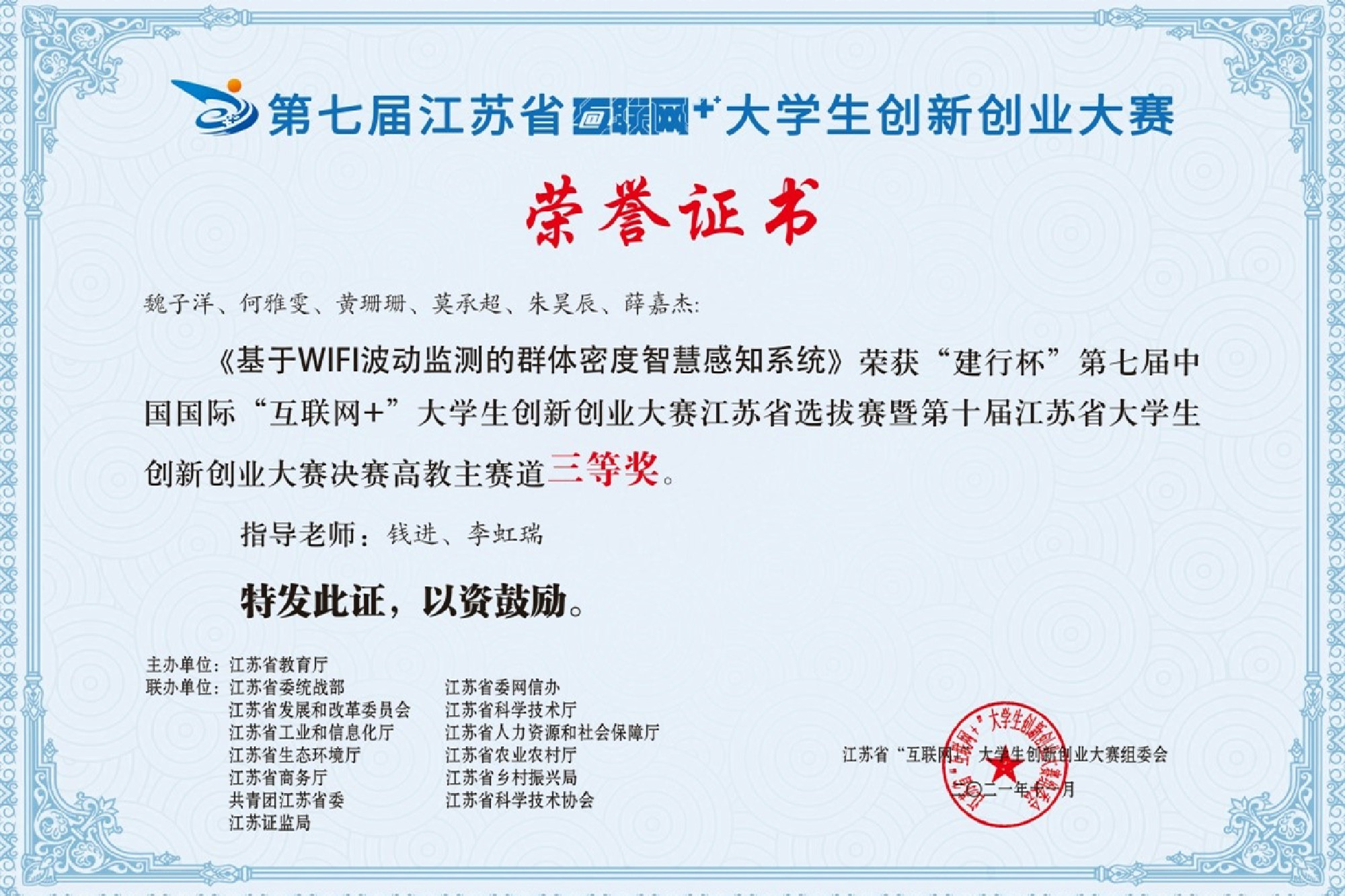 近日,省教育厅公布了第七届中国国际“互联网+”大学生创新创业大赛江苏省选拔赛暨第十届江苏省大学生创新创业大赛结果。经校级初赛、省级复赛和省级决赛,米兰官网钱进、李虹瑞老师指导,魏子洋等6名同学的参赛作品《基于WiFi 波动监测的群体密度智慧感知系统》获高教主赛道三等奖;朱以财老师指导,刘舒钰等4名同学的参赛作品《“红乡绿壤”-5G 燎原云小镇多元平台搭建》获“青年红色筑梦之旅”赛道三等奖。