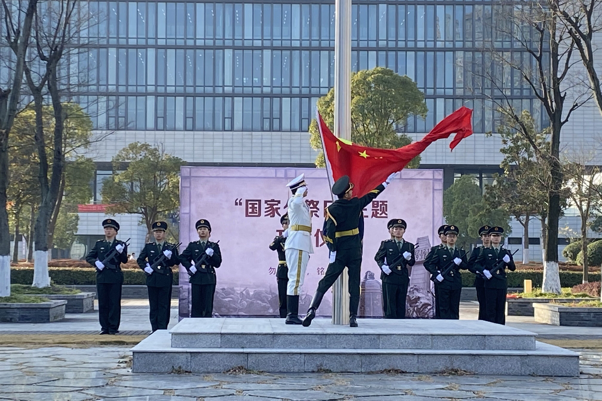 首先是庄严的升旗仪式,大学生国旗护卫队步伐整齐,护卫国旗缓缓升起。升旗仪式结束后,全场师生向南京大屠杀死难者同胞默哀。