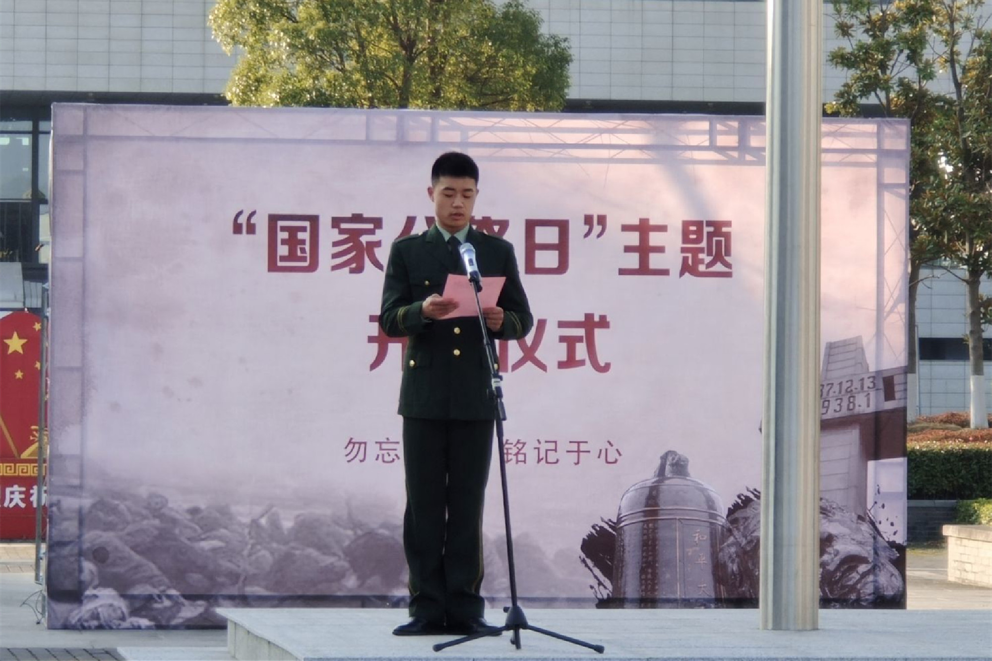 首先是庄严的升旗仪式,大学生国旗护卫队步伐整齐,护卫国旗缓缓升起。升旗仪式结束后,全场师生向南京大屠杀死难者同胞默哀。