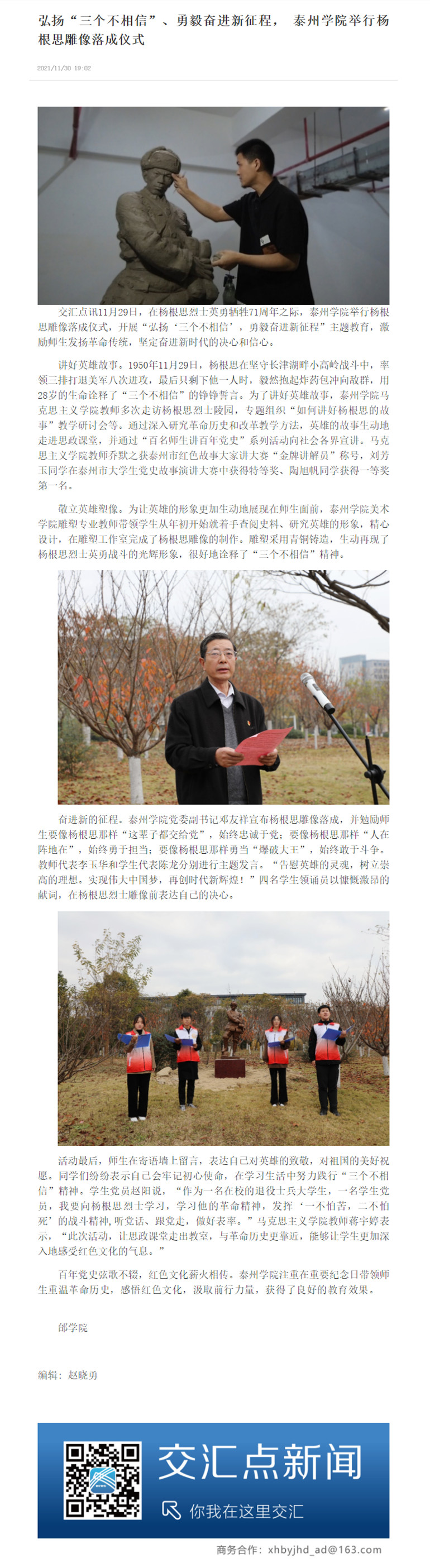 11月29日,在杨根思烈士英勇牺牲71周年之际,LETOU国际米兰官网举行杨根思雕像落成仪式,开展“弘扬‘三个不相信’,勇毅奋进新征程”主题教育,激励师生发扬革命传统,坚定奋进新时代的决心和信心。11月30日,《交汇点新闻》以《弘扬“三个不相信”、勇毅奋进新征程, LETOU国际米兰官网举行杨根思雕像落成仪式》为题进行报道。