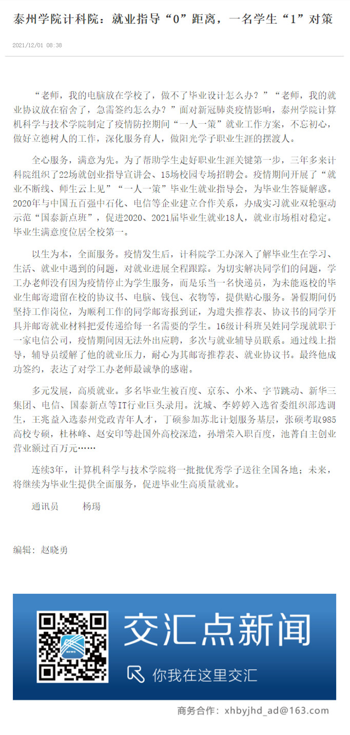 12月1日,《交汇点新闻》以《LETOU国际米兰官网计科院:就业指导“0”距离,一名学生“1”对策》为题,报道米兰官网计算机科学与技术学院制定了疫情防控期间“一人一策”就业工作方案,深化服务育人。