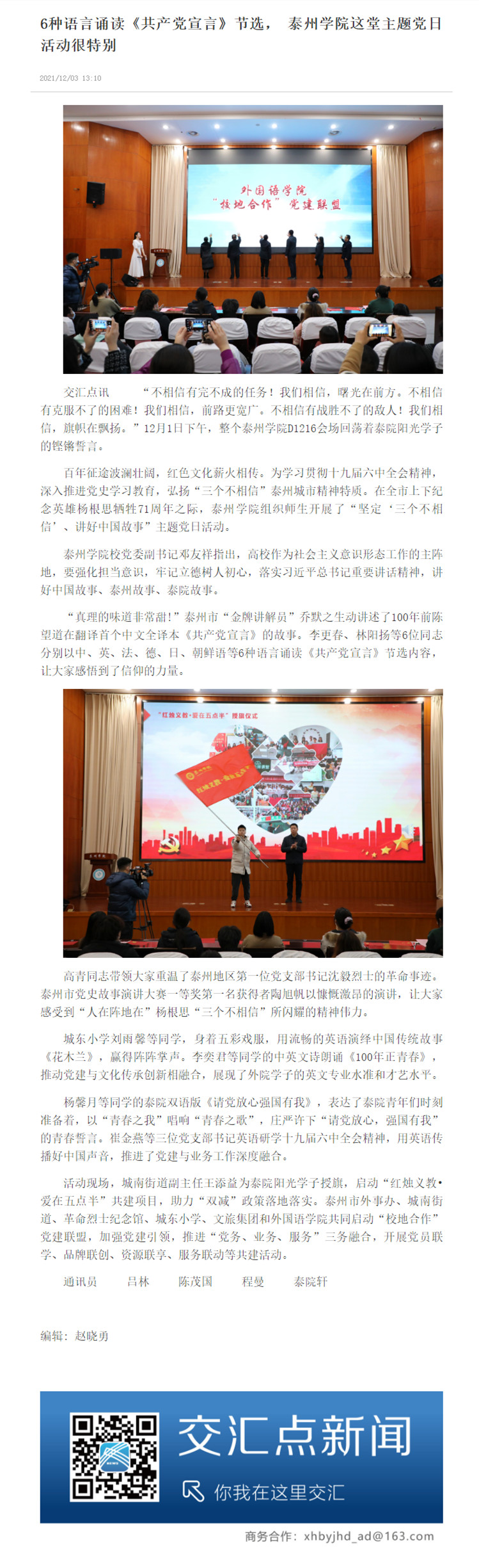 12月3日,《交汇点新闻》以《6种语言诵读<共产党宣言>节选, LETOU国际米兰官网这堂主题党日活动很特别》为题,报道米兰官网组织开展“坚定‘三个不相信’、讲好中国故事”主题党日活动。