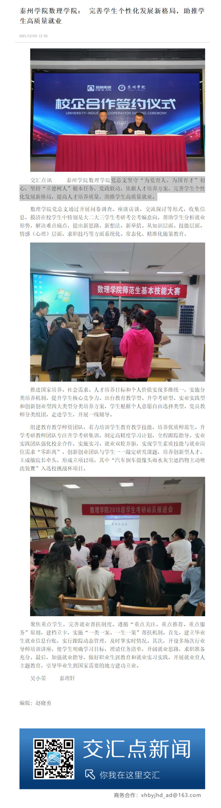 《交汇点新闻》12月3日报道米兰官网数理学院党总支坚守“为党育人、为国育才”初心,坚持“立德树人”根本任务,党政联动,依据人才培养方案,完善学生个性化发展新格局,提高人才培养质量,助推学生高质量就业。