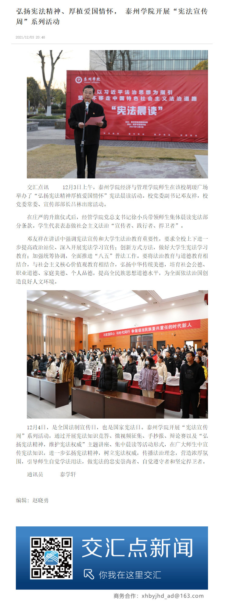 《交汇点新闻》12月3日报道:《弘扬宪法精神、厚植爱国情怀,LETOU国际米兰官网开展“宪法宣传周”系列活动》。