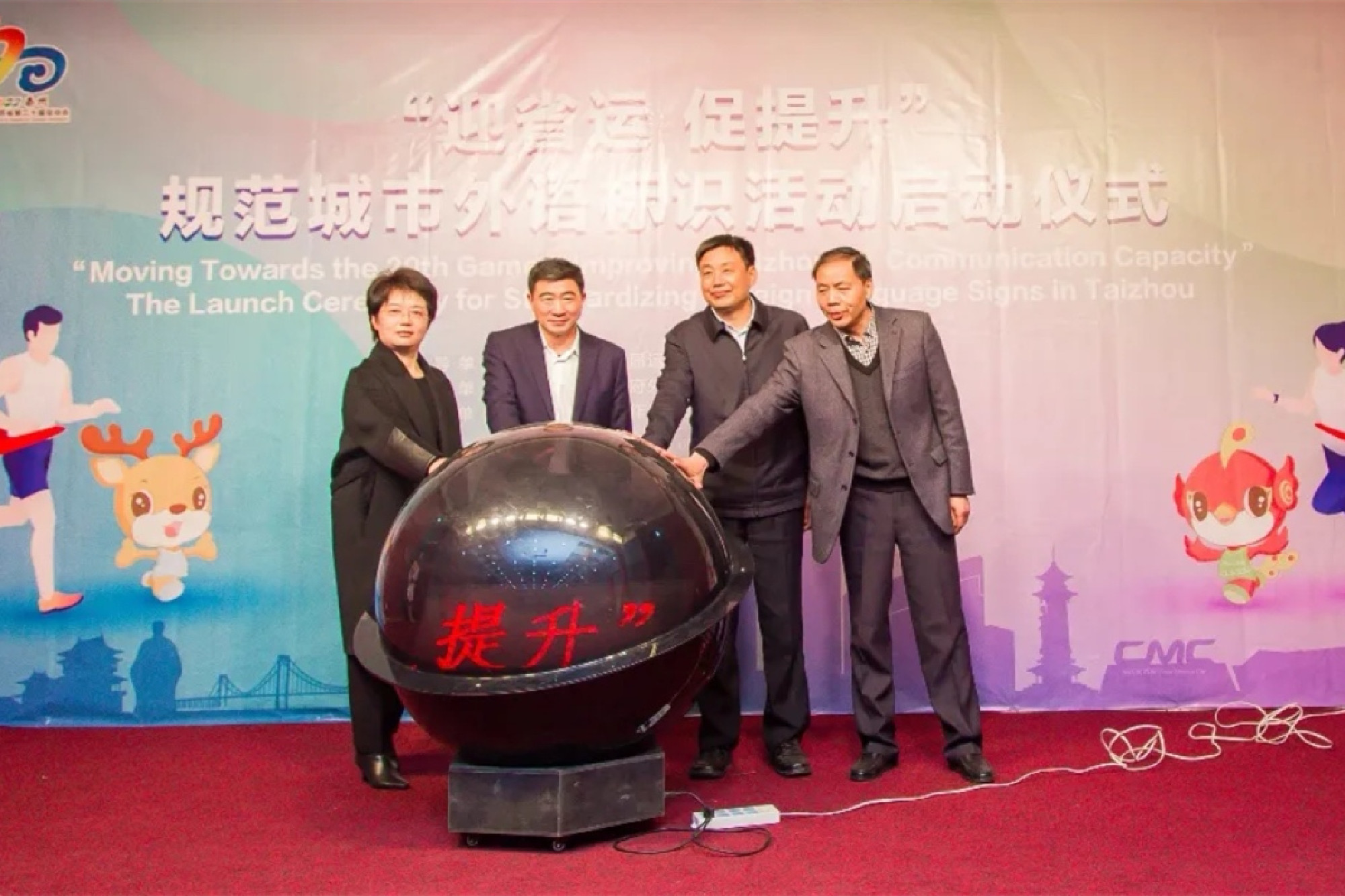 中共泰州市委副秘书长、泰州市体育局党组书记、局长董维华,泰州市外办主任张兆洋,泰州市文旅集团党委委员、副总经理叶慧莲,泰州市翻译工作者协会会长李洪金共同启动“迎省运 促提升”规范城市外语标识活动装置。董维华向泰州市翻译工作者协会授旗。启动仪式现场发布了《泰州市公共场所标志英文翻译规则》,同时公布了“规范城市外语标识”公共邮箱。