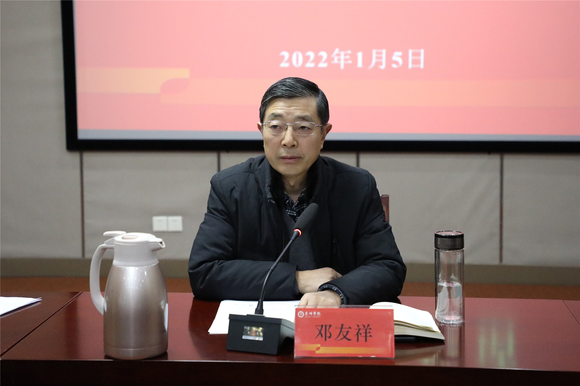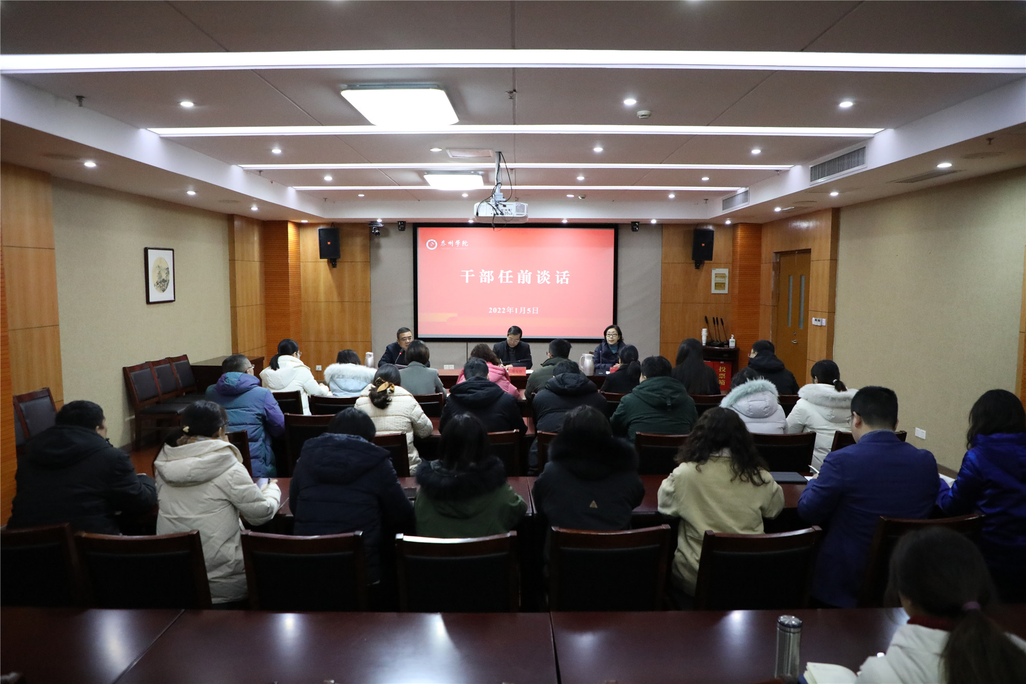 1月5日,学校在行政楼D1214会议室开展新提任科级干部任前集体谈话。校党委副书记邓友祥,校党委常委、纪委书记吴菁到会讲话。新提任的26名科级干部参加会议,会议由党委常委、组织部部长吉泰根主持。