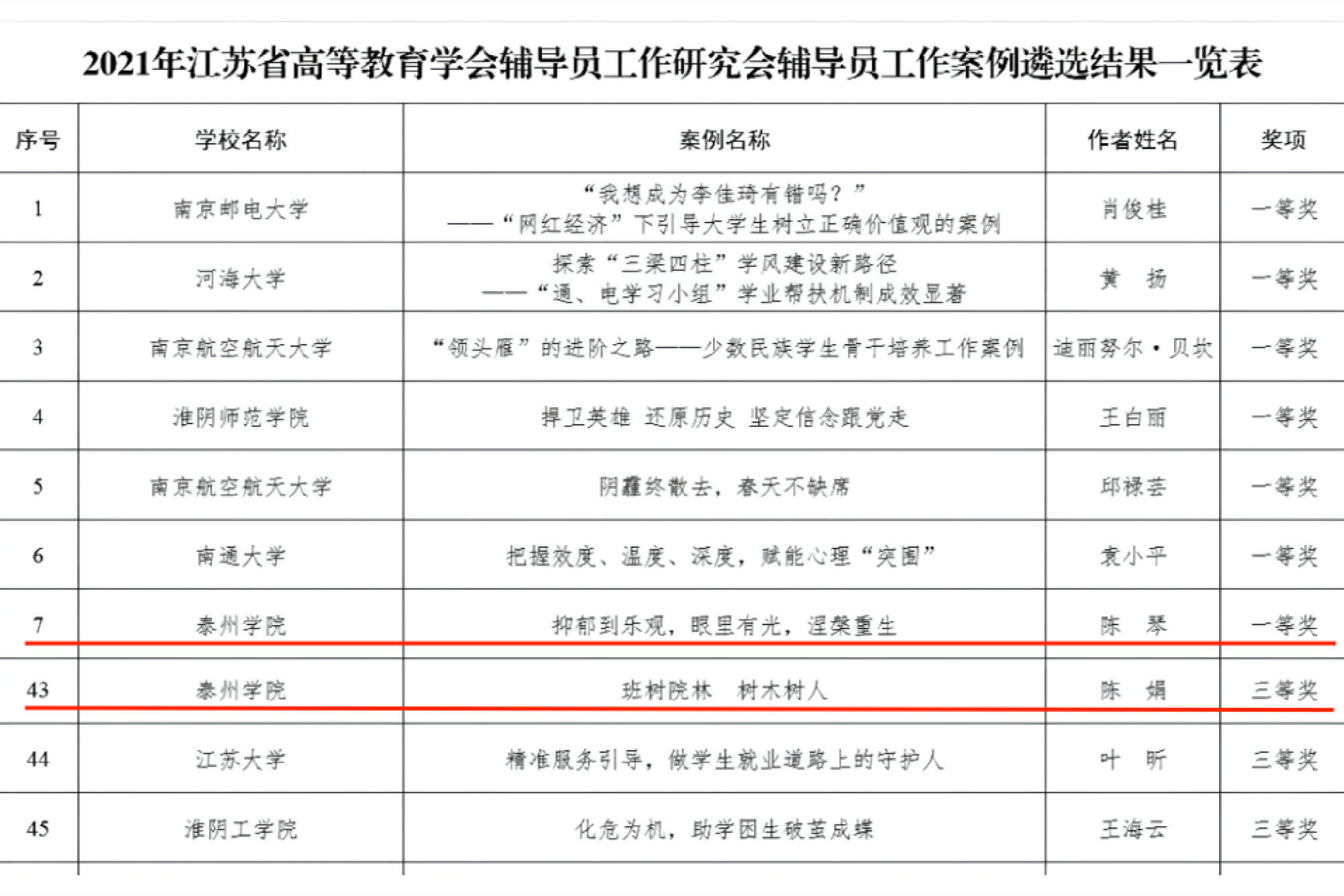 近日,江苏省高等教育学会辅导员工作研究委员会公布了2021年全省高校辅导员工作案例遴选结果,米兰官网人文学院辅导员陈琴的工作案例《抑郁到乐观 眼里有光 涅槃重生》获一等奖、船舶与机电工程学院辅导员陈娟的工作案例《班树院林 树木树人》获三等奖。本次评选经学校推荐、形式审查、专家评审,最终遴选出一等奖12项、二等奖25项、三等奖37项,米兰官网系首次获得该奖项一等奖。