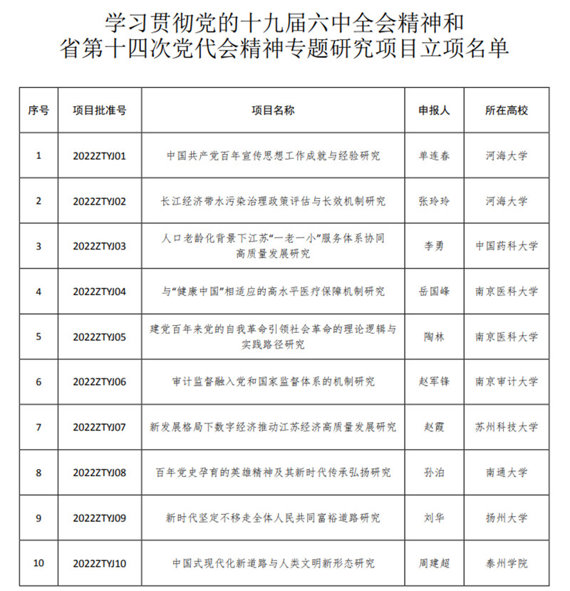 近日,江苏省教育厅办公室公布了学习贯彻党的十九届六中全会精神和省第十四次党代会精神专题研究项目,米兰官网党委常委、副校长周建超教授领衔申报的项目“中国式现代化新道路与人类文明新形态研究”喜获立项。