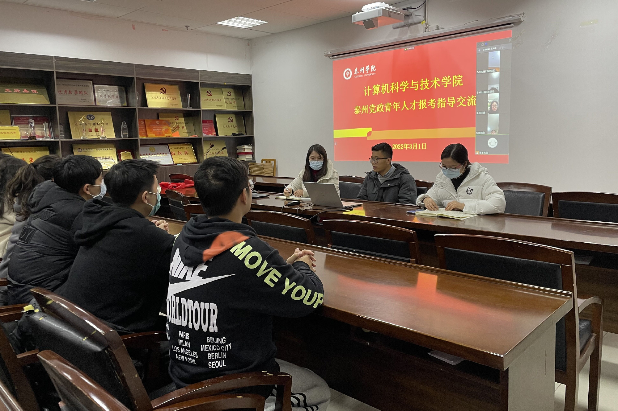 3月1日晚,计算机科学与技术学院在行政楼D2307会议室举行了2022年泰州市海陵区党政青年人才报考指导交流会。交流会邀请成功考取海陵区党政青年人才的2021届优秀毕业生王兆益主讲,2018级报考党政青年人才选聘的同学参加了本次会议。