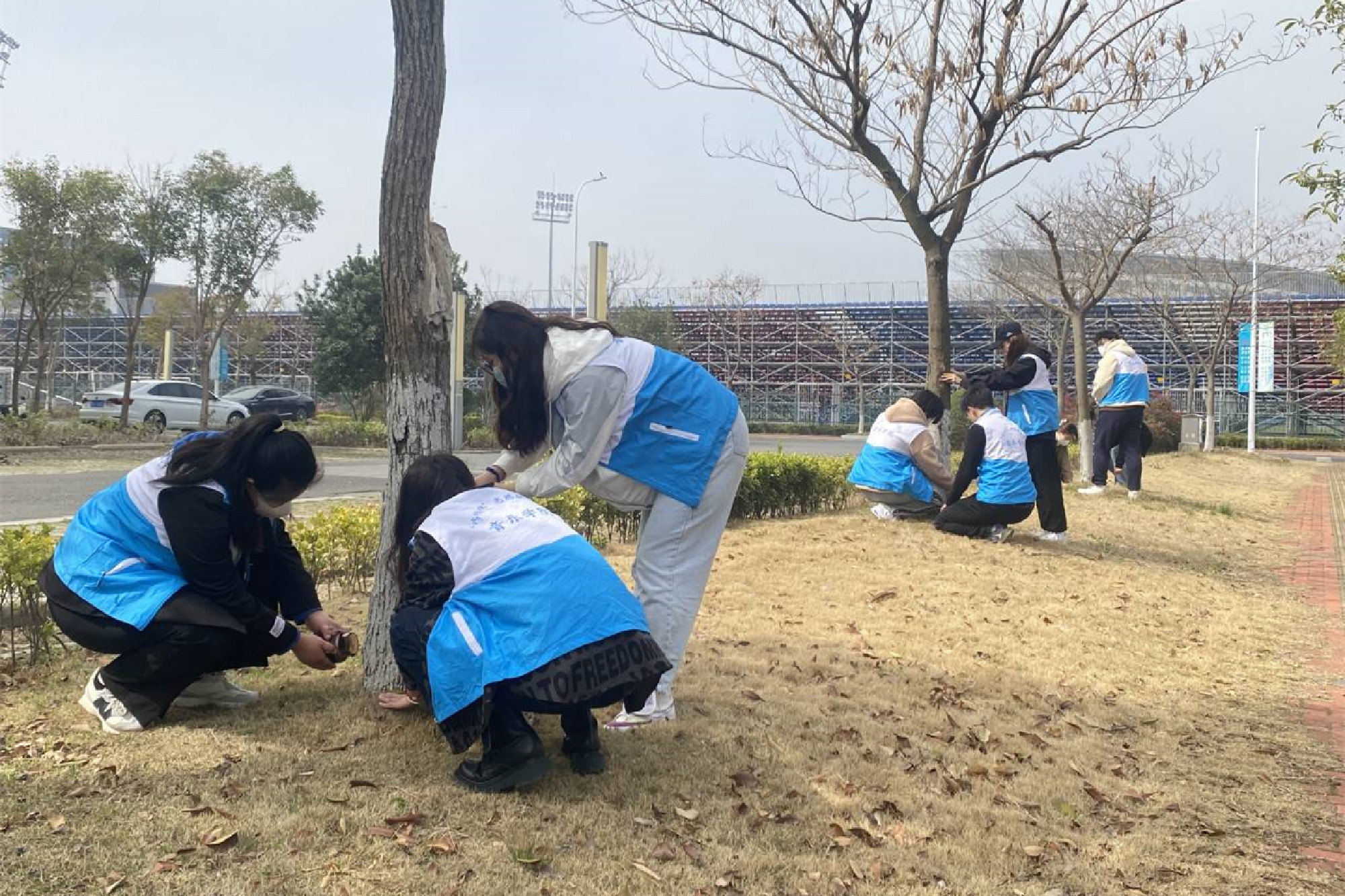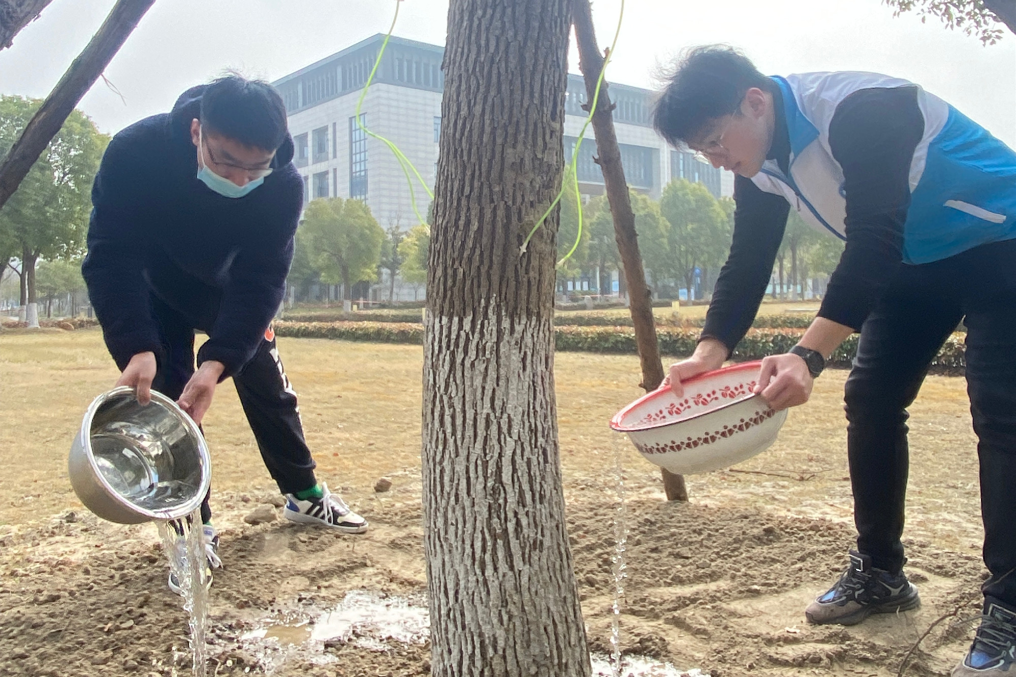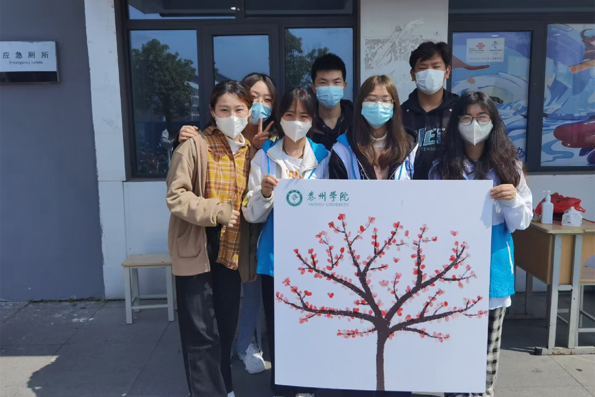 3月12日上午,在辅导员蔡宁远的带领下,同学们先给艺术楼周围新栽的树木浇水,然后院公益部在学生宿舍区开展了生态环境主题教育活动,现场的同学用自己的手印,绽放出一朵朵象征盎然春意的桃花。