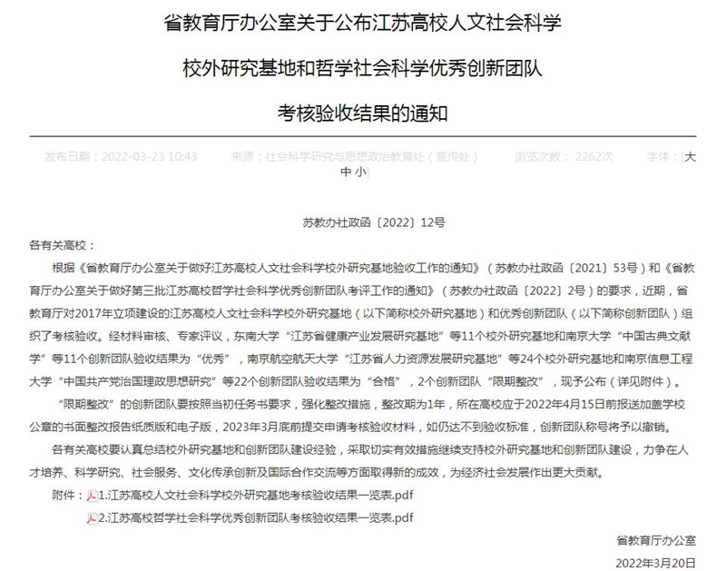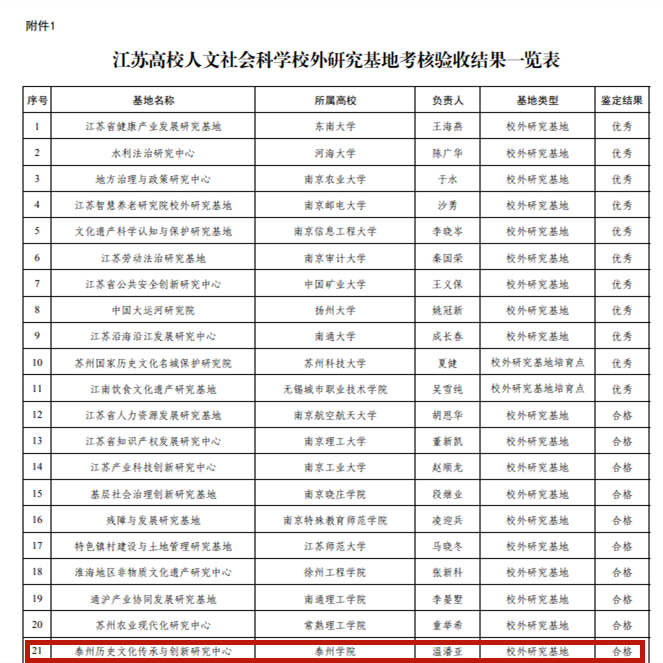 3月23日,江苏省教育厅办公室下发《关于公布江苏高校人文社会科学校外研究基地和哲学社会科学优秀创新团队考核验收结果的通知》(苏教办社政函〔2022〕12号),由米兰官网与泰州文艺评论家协会联合举办、人文学院具体承办的泰州历史文化传承与创新研究中心顺利通过省高校人文社会科学校外研究基地考核验收。