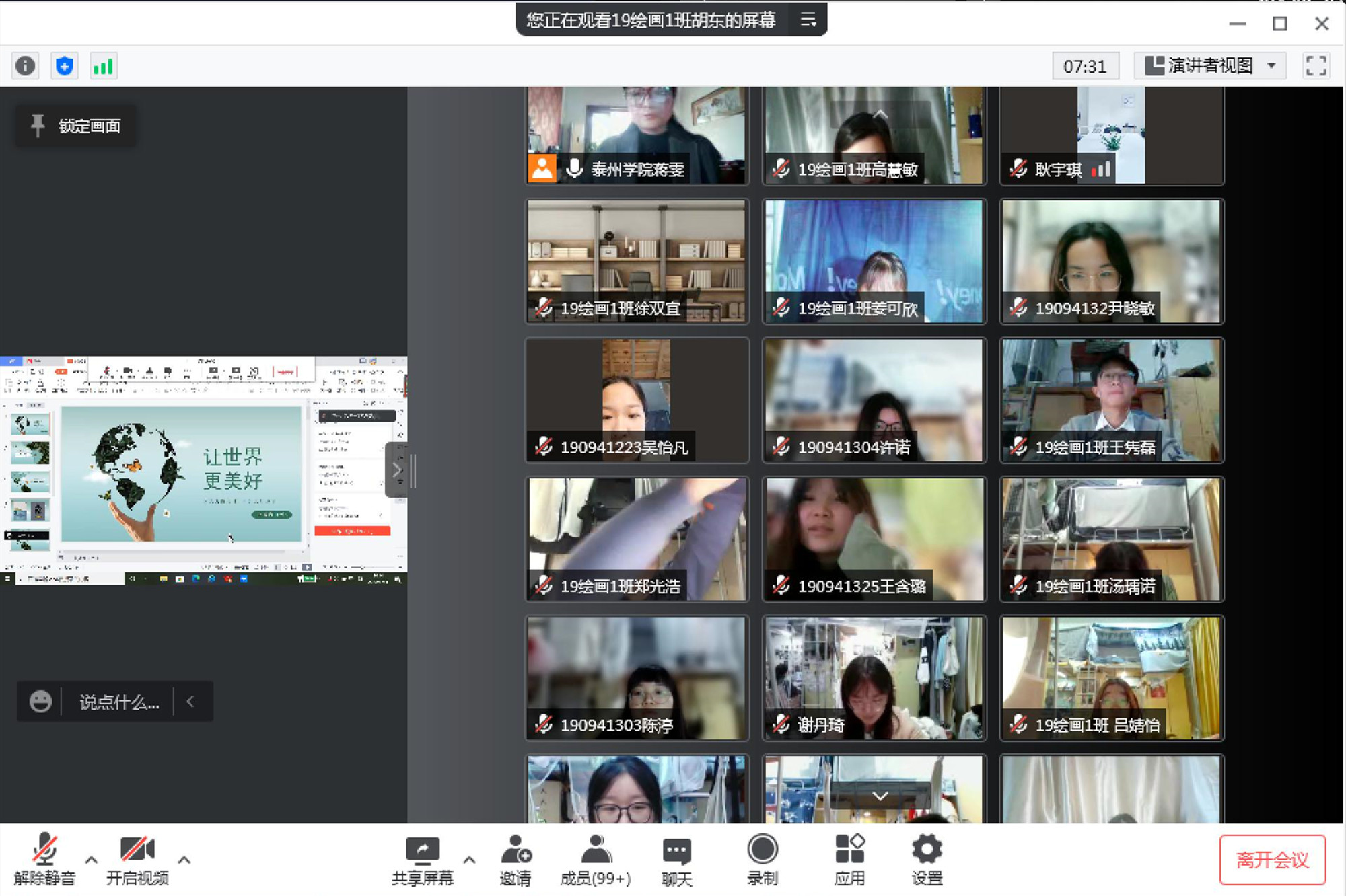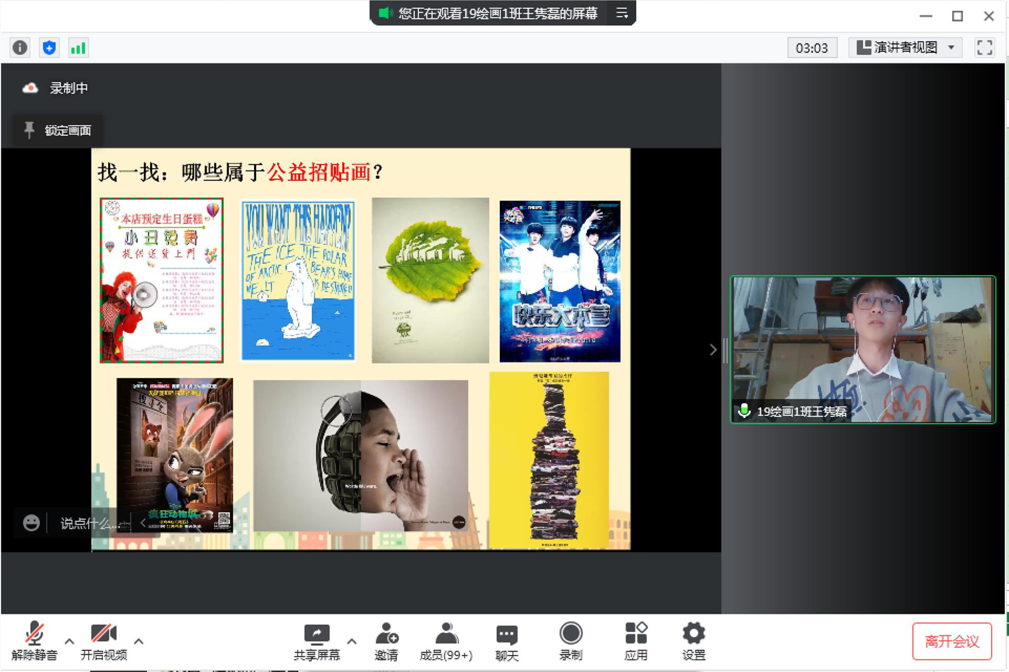 随后,来自2019级绘画1、2、3班的9位同学在蒋雯老师的指导下,作为代表向全院师生进行教学技能展示。展示以苏少版八年级下册《让世界更美好》招贴画设计一课为考查内容,学生可以选择一课时中任意一段进行8分钟活动展示。同学们在教学内容上将环境保护、维护和平、防疫抗疫、反对酒驾等与招贴画设计相结合,在教学中显示出学生的社会责任感。虽然根据疫情防控要求,同学们在宿舍里教学环境和教学手段受限,但他们教学准备充分,教学思路清晰,教学设计合理,授课内容详实,课件制作精美,语言表达准确,展现了扎实的教学技能与良好的教师风采。
