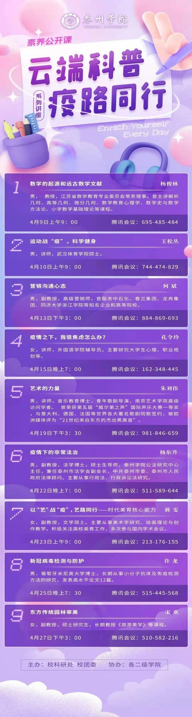 学校还将开设包含《疫情下的非常法治》《以艺站疫,艺路同行》《新冠病毒检测与防护》《东方传统园林审美》等主题在内的“云端科普、疫路同行”系列讲座。通过系列讲座,丰富学生课余生活的同时,帮助学生以积极乐观、理性平和的心态应对疫情,健康阳光地学习生活。(科研处、团委)