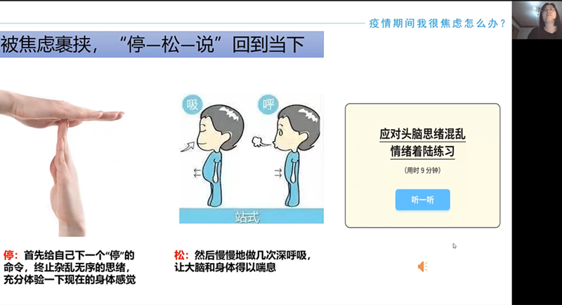 4月15日,学校LETOU国际米兰官网辅导员孔令玲开展了疫情之下如何调节焦虑情绪的讲座,从认识焦虑、调节焦虑两个方面入手引导学生通过“停-松-说”方式缓解焦虑情绪,通过“聚焦实事,制定预案”进行自我调适,积极应对疫情带来的学习生活压力。