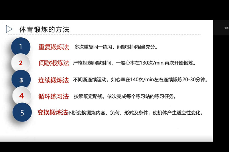 研究表明,体育锻炼对心理健康有积极的促进作用。4月10日,公共体育部老师王松丛开展“运动战疫、科学健身”线上讲座,从健康概述、运动对健康的影响、运动健身方案的制定等方面,对学生加强体育运动、促进身心健康进行指导。