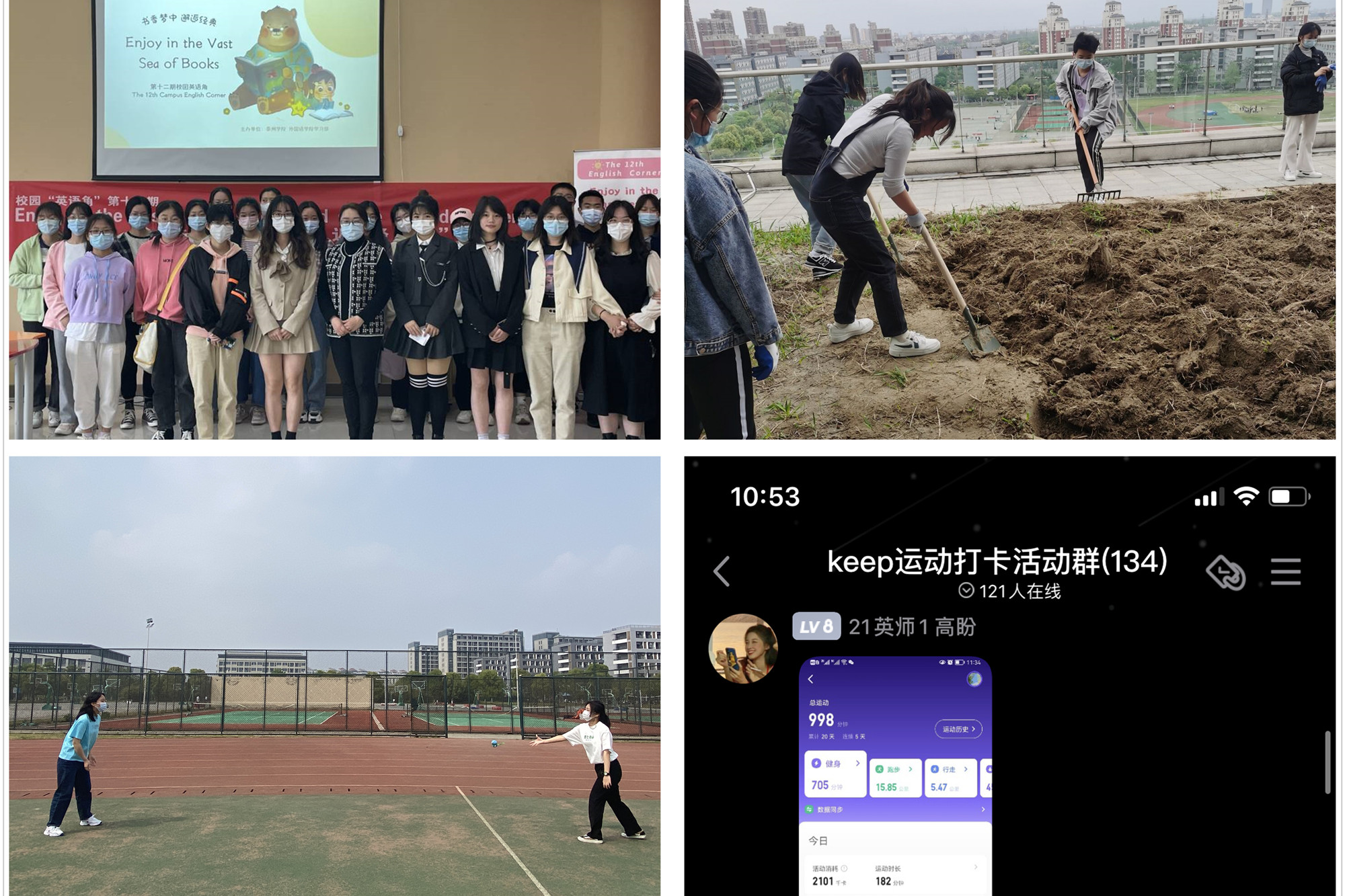 疫情期间为了进一步丰富同学们的校园生活,提高同学们的免疫力,促进积极情绪的产生,学院举办了多种多样的活动。开展“开放共兴,相聚奥运”和“书香梦中,邂逅经典”2期校园英语角活动,为同学们提供缓解压力、展现英文口语表达能力的平台。运动是最好的解压方式,组织开展“忆童年,泰青春”扔沙包游戏、“Keep Fit”运动打卡、“漫步图书馆”等活动,让同学们在回忆儿时游戏快乐的同时也能放松心。针对同学们长期的宅生活,组织带领同学们参加“绿色校园行动”在校园内除草松土,让劳动最光荣、劳动最美丽成为校园的一道美丽风景,不仅为这个春天增添了一抹亮丽色彩,也为抗击疫情凝聚了强大力量。