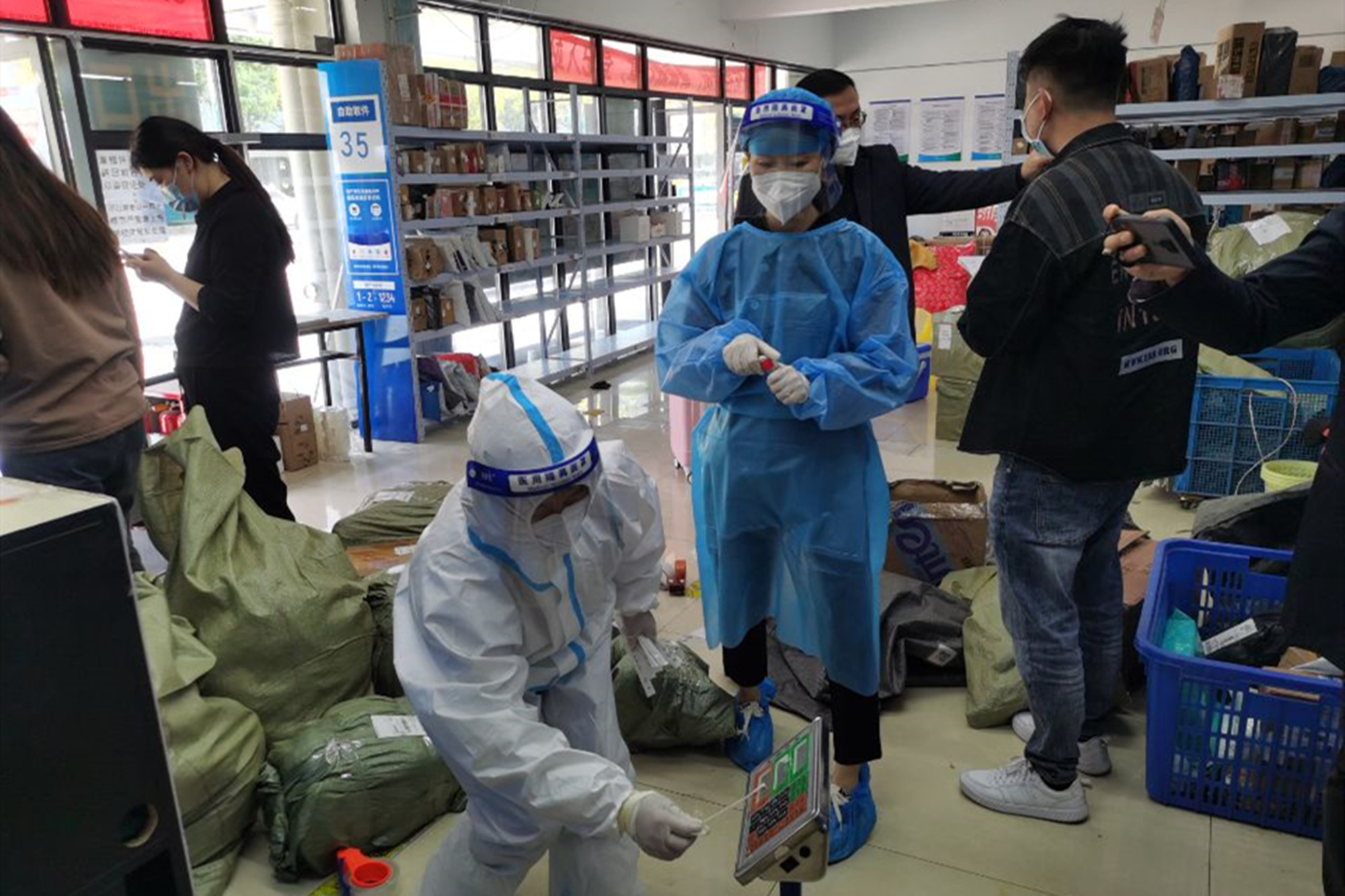 医务人员首先对各现场环境进行勘察,确定要采样的点位,随后对各个场所的门把手、桌面、地面、记录本等与人、货物接触较多的物体表面进行了样本采集。在菜鸟驿站,医务人员特别对快递的外包装进行采样,记录下快递单号,并告知工作人员被抽检的快递在检测报告出来后方可入库发放。采样结束后,医务人员对样本进行封存。采样过程中,防控办再次要求各场所工作人员要严格按照防疫要求,佩戴口罩,做好消杀工作,将“人物同防”的防控策略落实到位。
