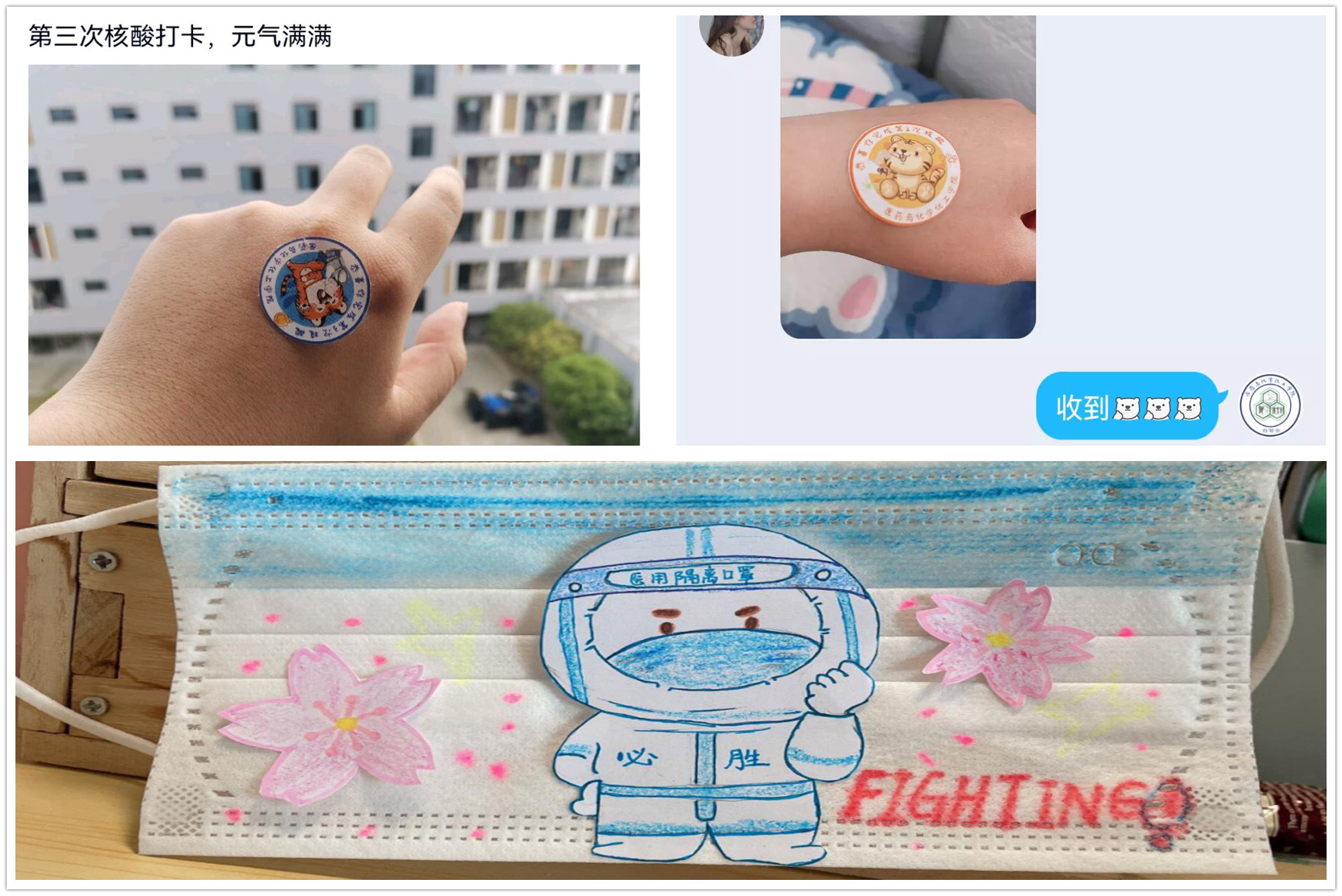 LETOU国际米兰官网组织同学们开展口罩涂鸦活动,发挥大家的想象与特长,为疫情生活增添一抹色彩,也让同学们养成戴口罩的习惯,把“文明”牢记心中。医药与化学化工学院推出定制核酸检测贴纸“拜拜虎”打卡活动,根据每轮参加的核酸检测次数领取对应的贴纸,并晒图、写感想,鼓励同学们积极配合防疫工作,相互之间多交流多沟通。