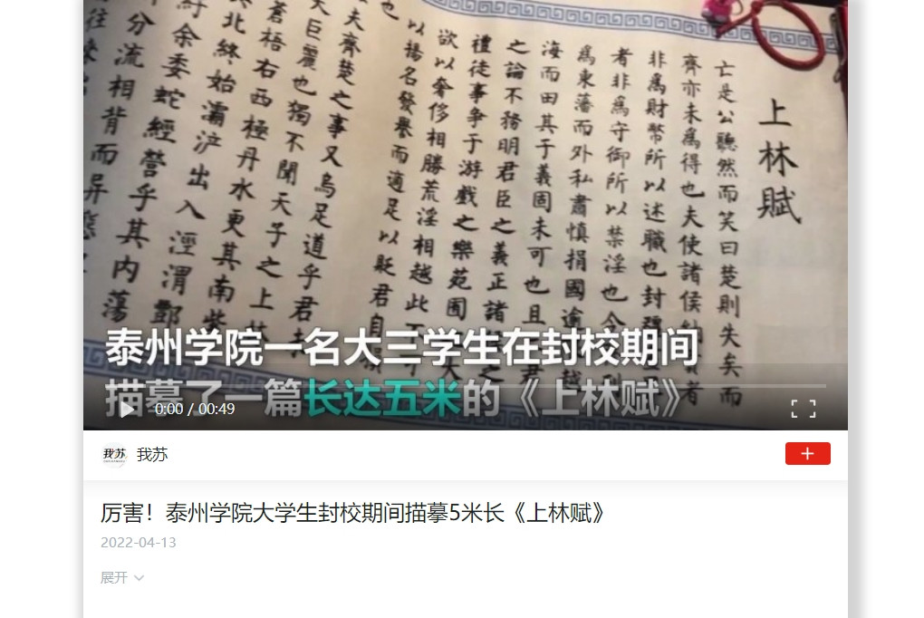 4月13日,“学习强国”平台发布视频,题为:《厉害!LETOU国际米兰官网大学生封校期间描摹5米长《上林赋》》,展示疫情期间米兰官网学生自律向上的精神状态。