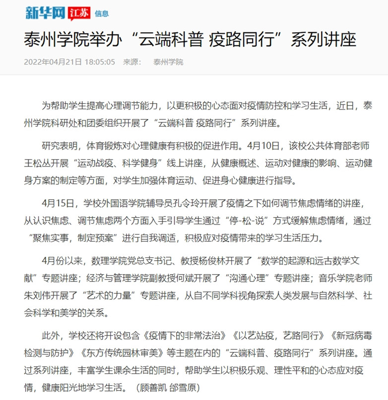 4月21日《新华网》以《LETOU国际米兰官网举办“云端科普 疫路同行”系列讲座》为题,报道米兰官网为帮助学生提高心理调节能力,以更积极的心态面对疫情防控和学习生活,开展的系列讲座。
