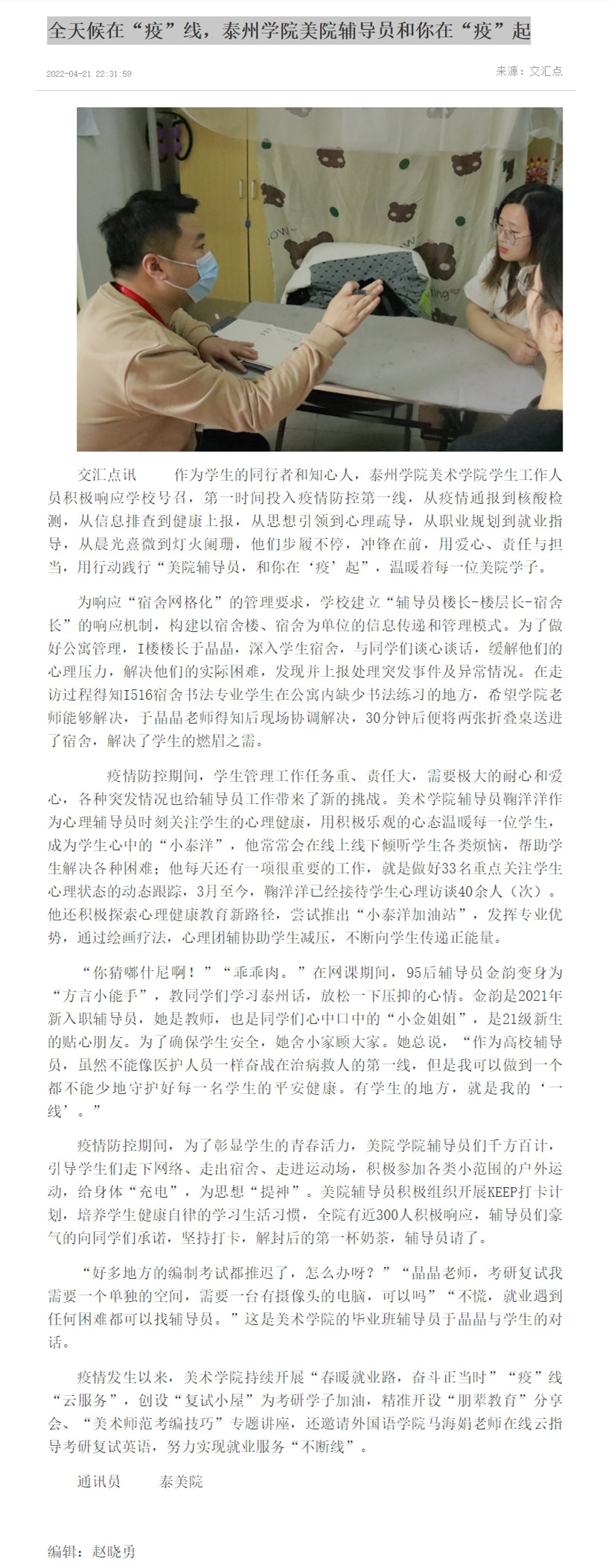 《交汇点新闻》4月21日报道:《全天候在“疫”线,LETOU国际米兰官网美院辅导员和你在“疫”起》。