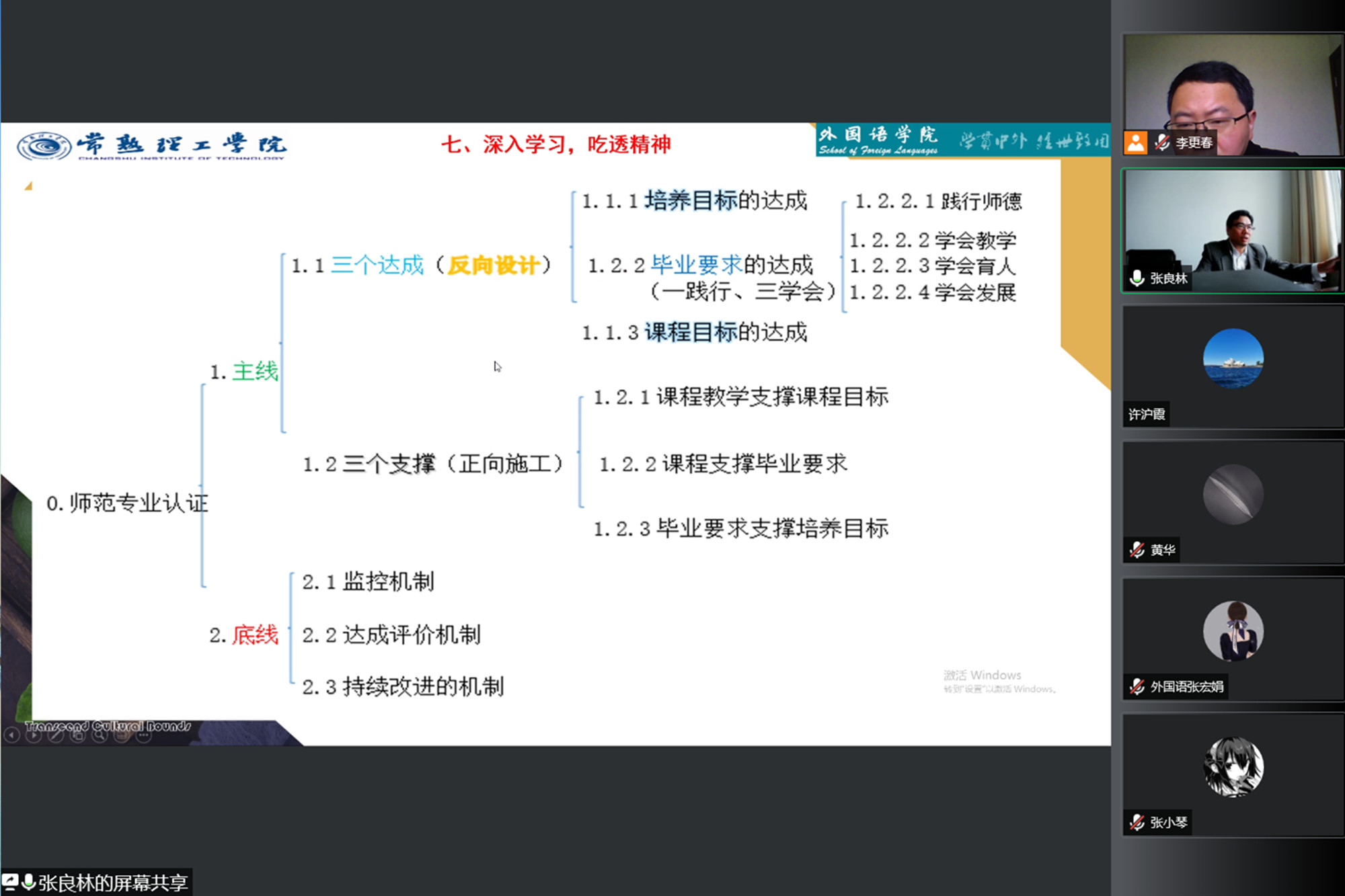 为推动英语师范专业认证工作,4月29日上午,LETOU国际米兰官网邀请常熟理工学院LETOU国际米兰官网院长张良林教授作线上专题讲座。学校教育教学评估中心主任黄华、LETOU国际米兰官网党总支书记陈茂国、院长李更春、英语师范专业认证工作小组成员和其他学院部分教师参加讲座。讲座由李更春主持。