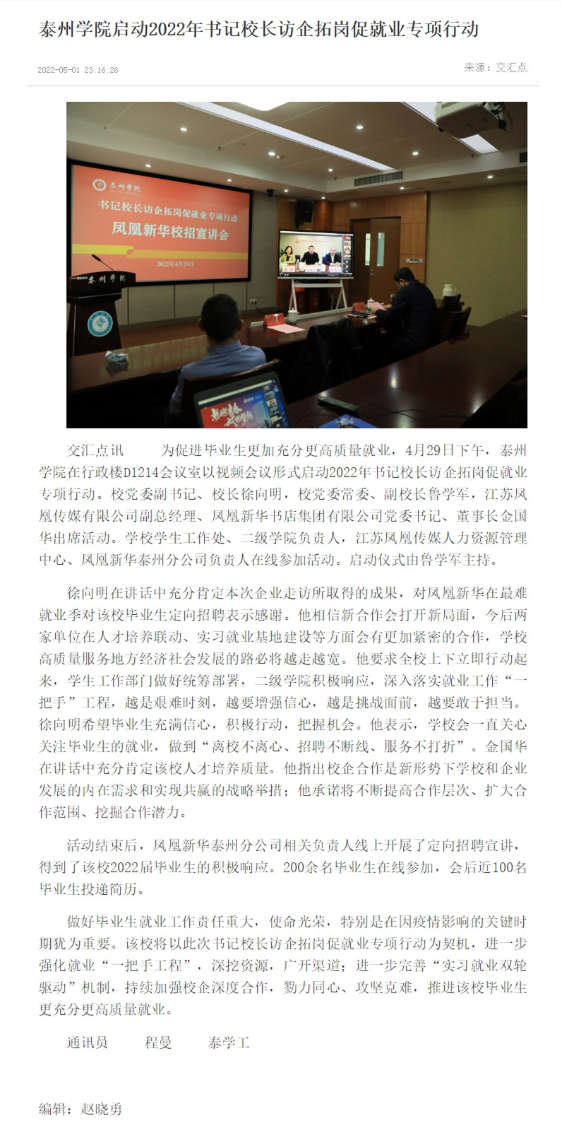 报道题为:《LETOU国际米兰官网启动2022年书记校长访企拓岗促就业专项行动》,链接:https://jnews.xhby.net/v3/waparticles/70/0/cmumGqdeyZTpYcW3/1