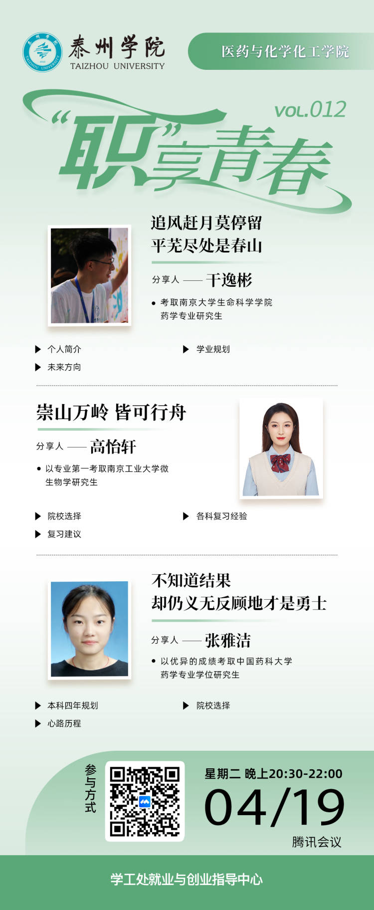 为激发同学们考研热情,帮助他们了解考研动态,做好考研同学的“传帮带”,医药与化学化工学院近期开展了线上、线下考研经验分享活动,邀请2022届考研成功学生干逸彬、高怡轩、张雅洁等与学弟学妹们分享考研经验。