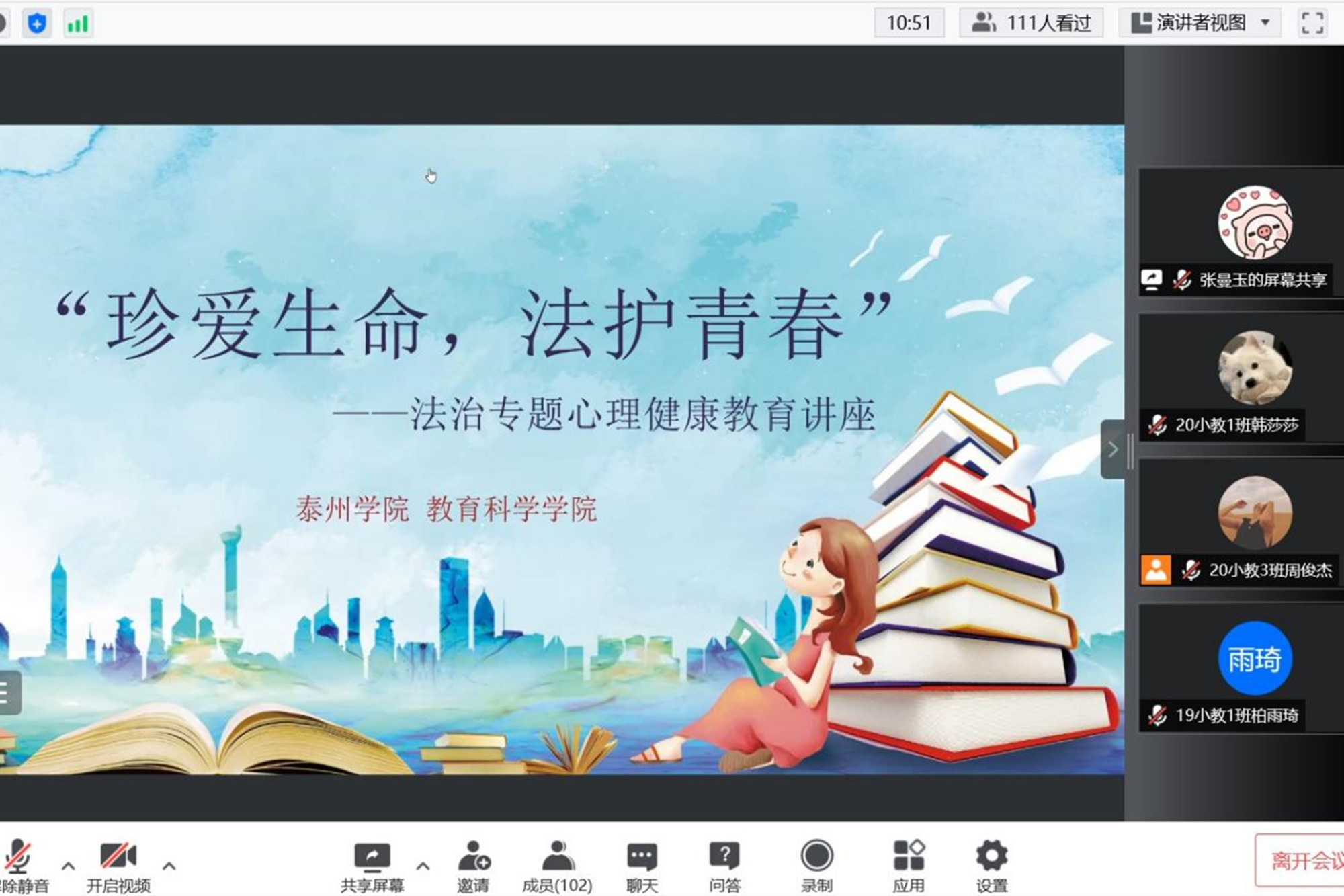 为深入贯彻习近平法治思想,落实“八五”普法规划和省检察院《检察建议书》(苏检建〔2018〕1 号)精神,LETOU国际米兰官网将法治教育与心理健康教育相结合,于5月11日在线开展“珍爱生命,法护青春”法治专题心理健康教育讲座。本次讲座由郭兆喜老师主讲,近300名学生参与。