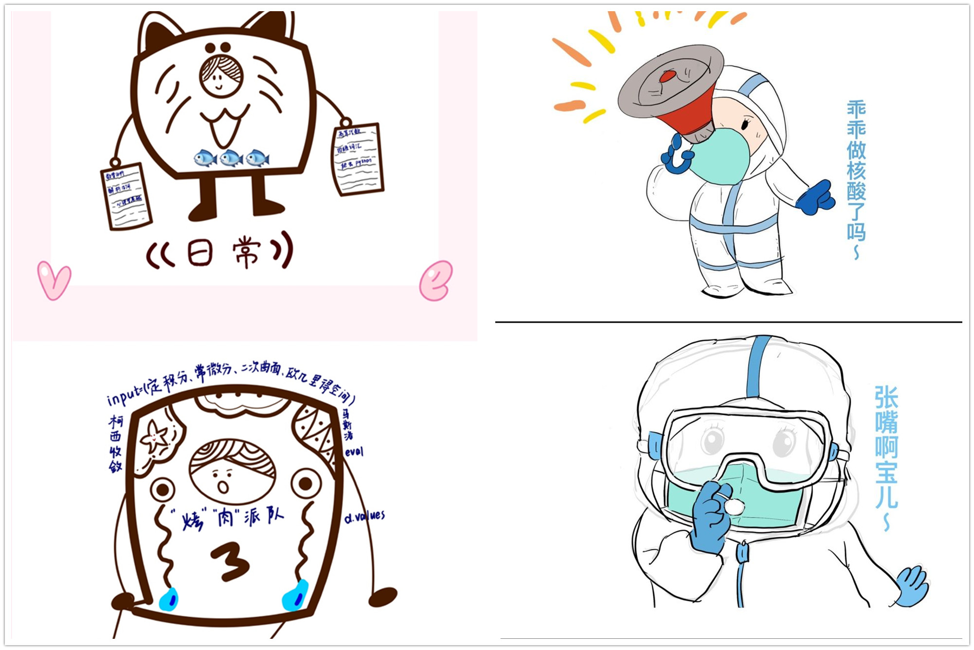 为引导学院同学担当作为,提振抗击疫情信心,彰显正能量,数理学院以宿舍为单位举办“花样青春,创意无限”表情包设计大赛。风格统一、生动有趣的表情包作品,描绘同学们学习生活、积极抗疫等场景,展示数理学子乐观的心态和创造性思维。