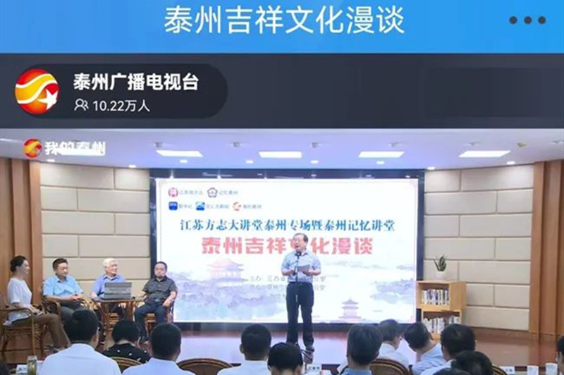 7月22日下午,由江苏省地方志办公室主办,泰州市党史方志办公室承办的“江苏方志大讲堂泰州专场暨泰州记忆讲堂”在泰州市档案馆记忆泰州书房开讲。省方志办党组书记、主任左健伟等省市领导,泰州地方志工作者,文史爱好者,部分市民及学生代表等约60人参加。讲堂通过新华社客户端、交汇点新闻、“我的泰州”APP等在线直播。据不完全统计,60多万观众在线观看了直播。