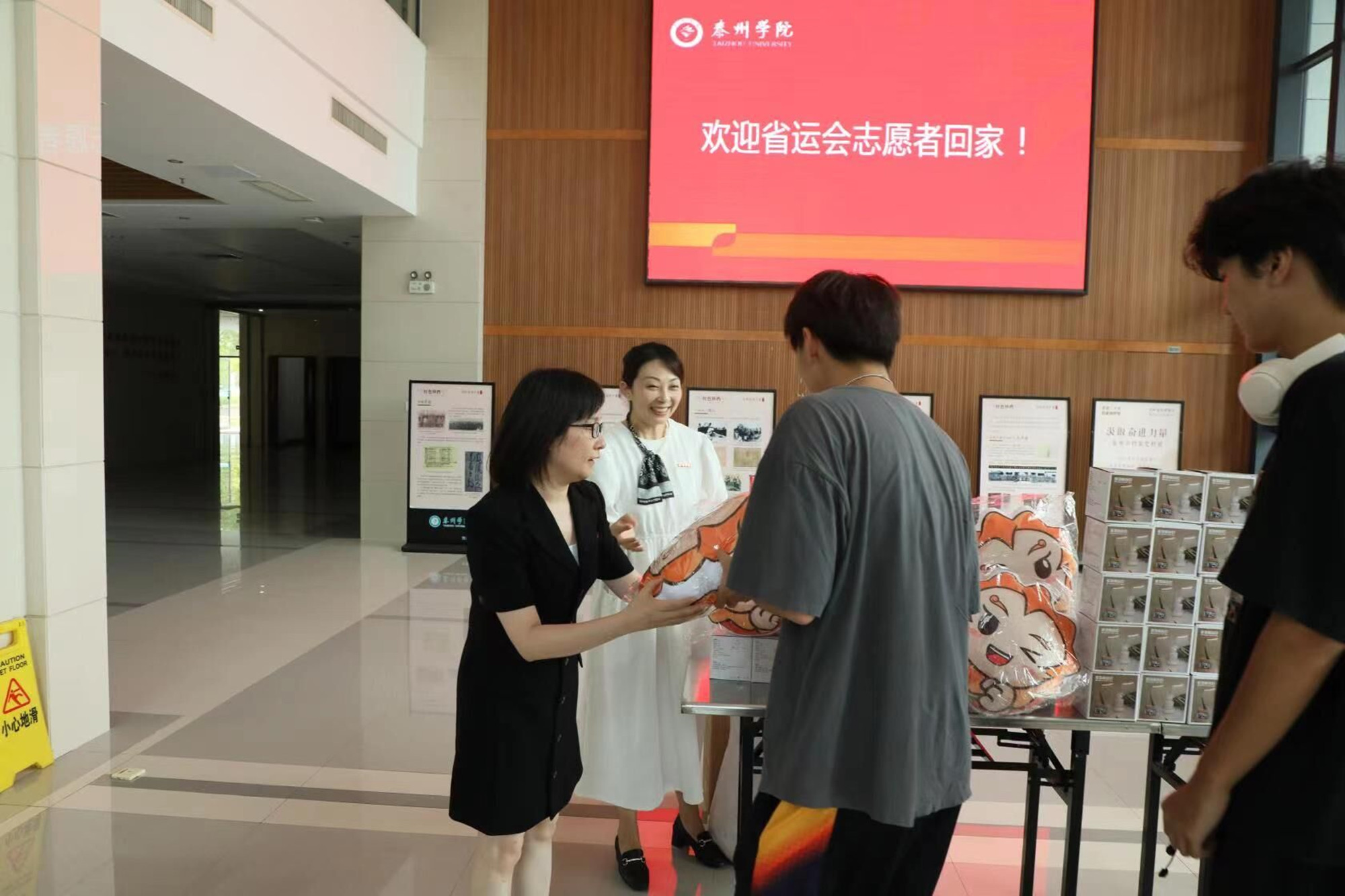 8月29日下午,米兰官网第一批表演志愿者返校,副校长卜慧芬带队在学校行政楼一楼大厅迎接志愿者归来,并向大家送上温暖大礼包。