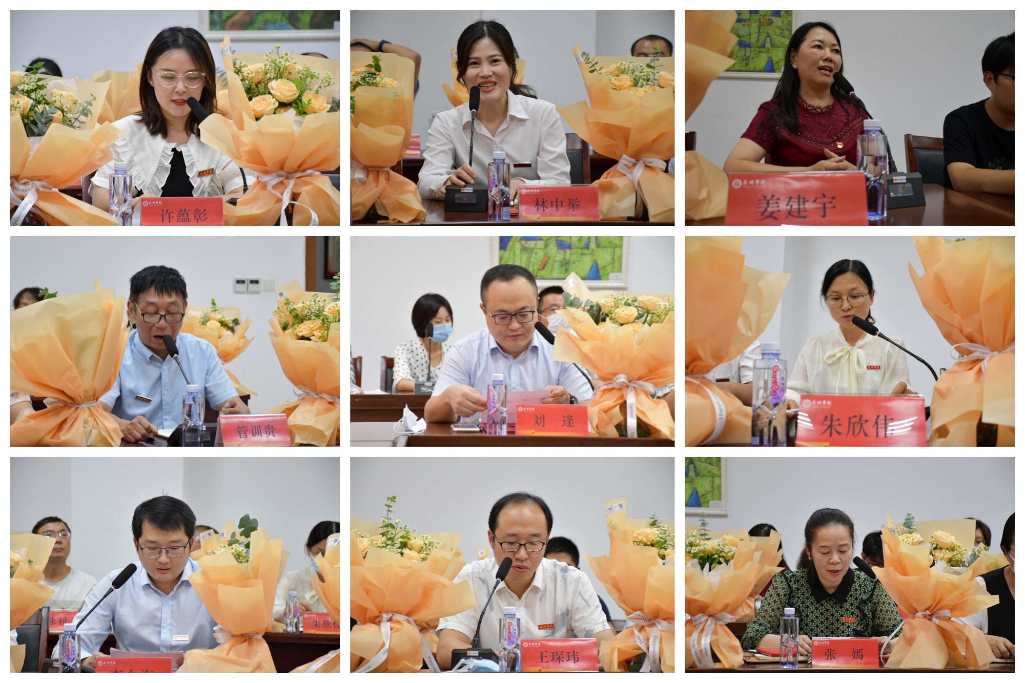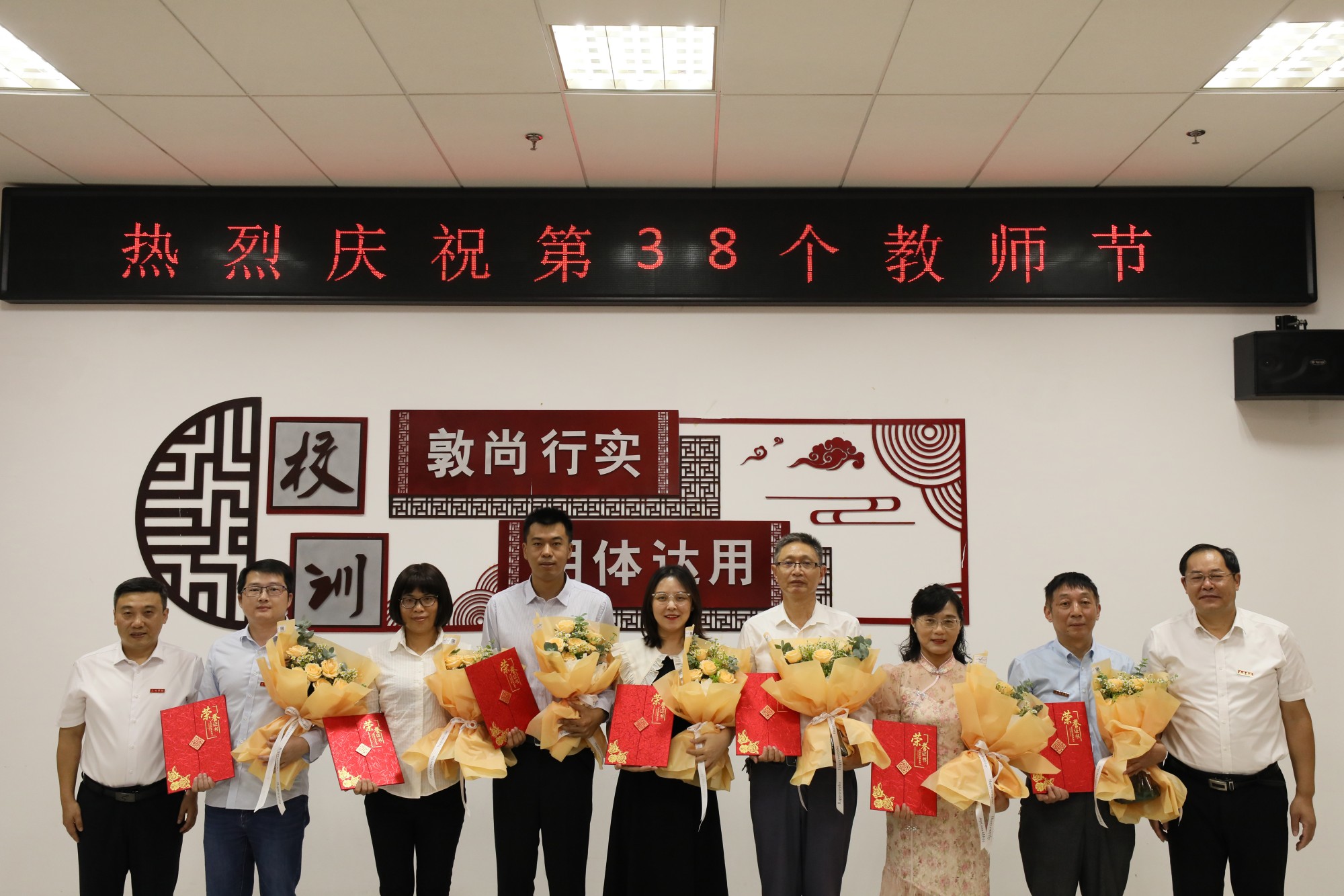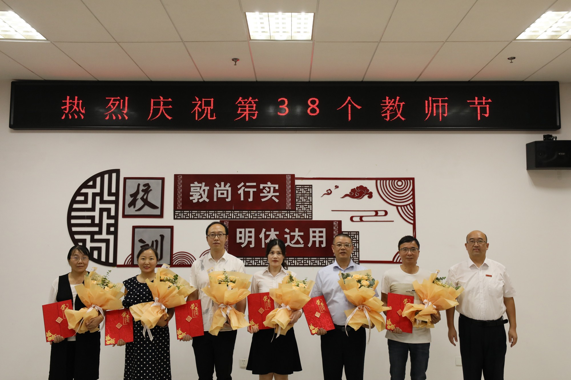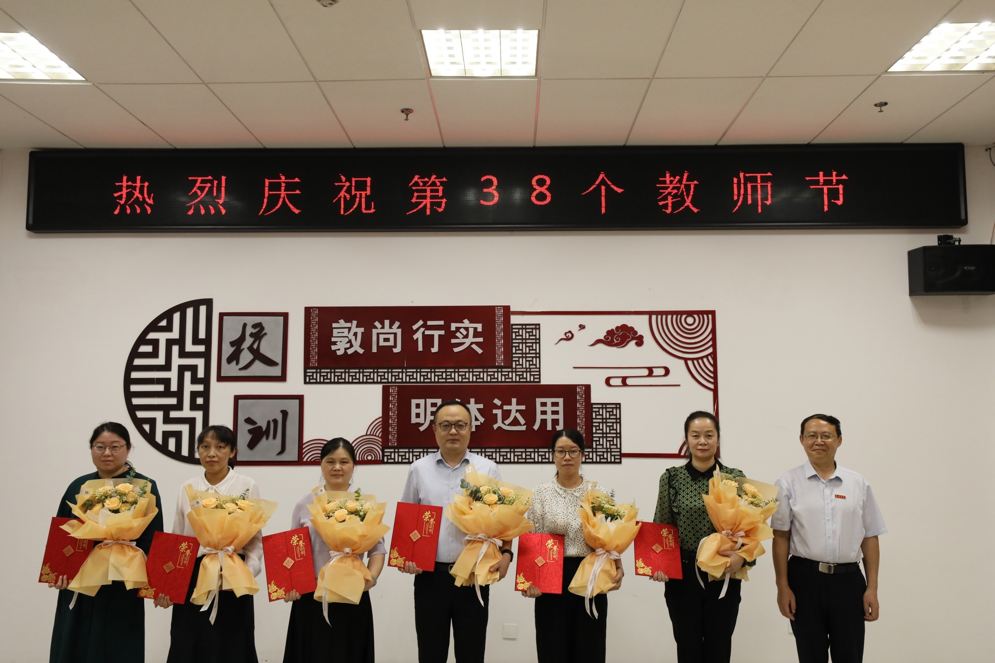 座谈会上,校领导为受表彰的教师颁发了荣誉证书和鲜花,并合影留念。校学生会的同学向老师们赠送了亲手制作的月饼,表达对师恩的感谢。