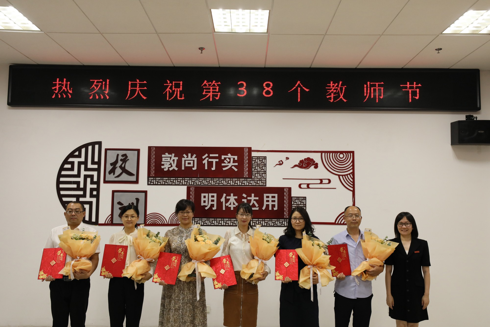 座谈会上,校领导为受表彰的教师颁发了荣誉证书和鲜花,并合影留念。校学生会的同学向老师们赠送了亲手制作的月饼,表达对师恩的感谢。