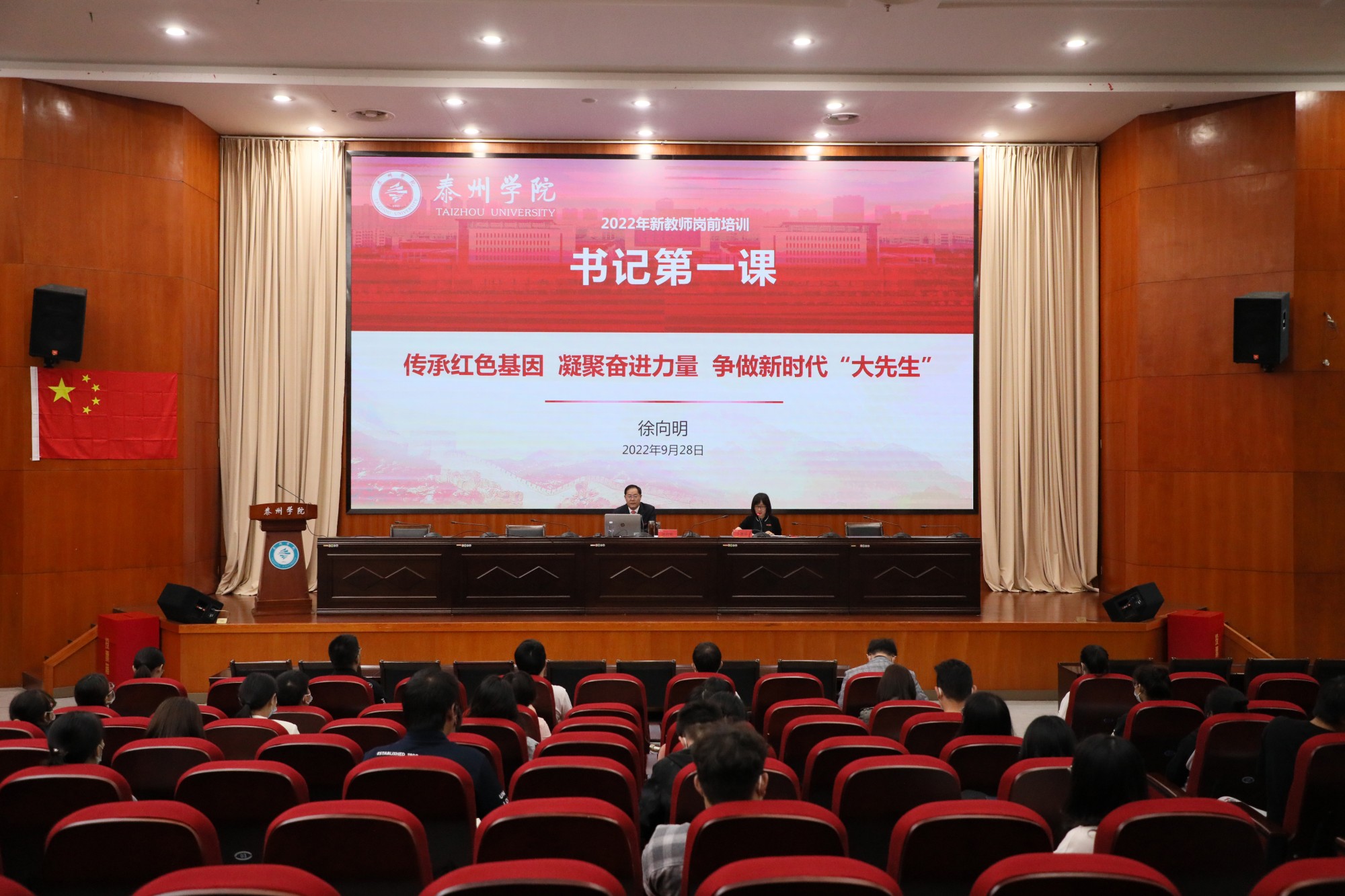 9月28日上午,校党委书记徐向明以《传承红色基因凝聚奋进力量争做新时代“大先生”》为题,为2022年新入职教师讲授了“书记第一课”,讲座由校党委常委、副校长卜慧芬主持。