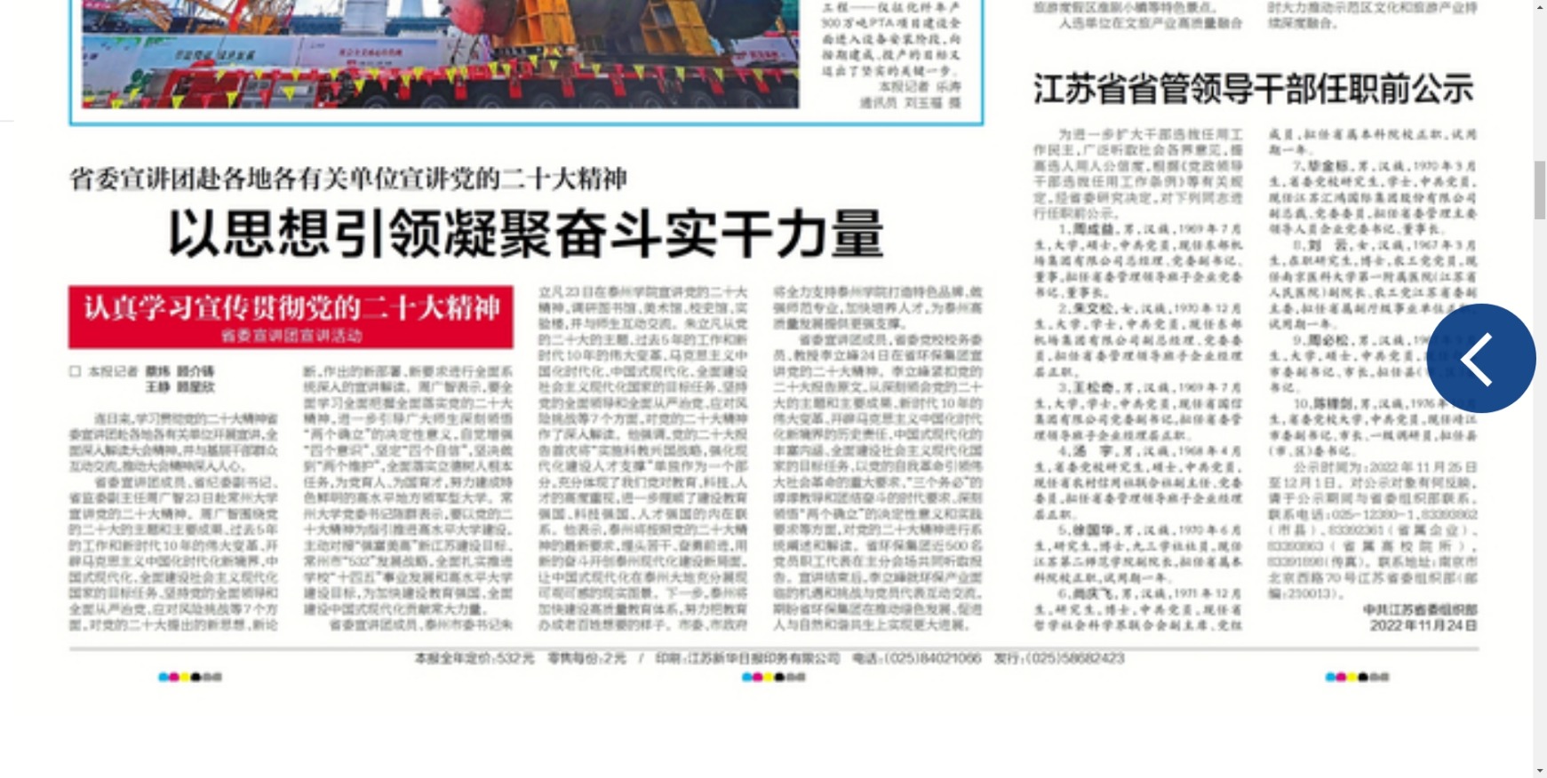 《新华日报》11月25日报道省委宣讲团成员、泰州市委书记朱立凡到米兰官网宣讲党的二十大精神,题为《省委宣讲团赴各地各有关单位宣讲党的二十大精神 以思想引领凝聚奋斗实干力量》,链接http://newspaper.xhby.net/?act=layout&layountIndex=1&date=20221125&siteID=2&id=1