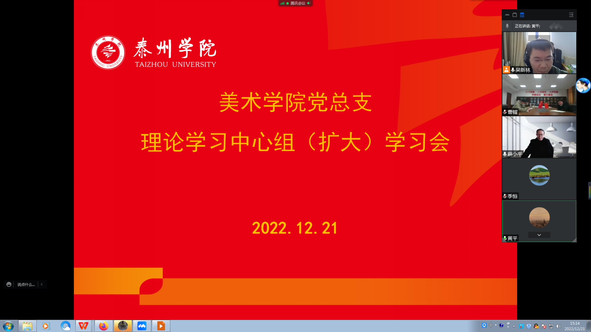 12月21日下午,校党委常委、副校长薛小平巡学旁听美术学院党总支理论学习中心组(扩大)学习会。本次会议采用线下、线上相结合的方式召开,院党总支书记吴新林主持会议,党总支理论学习中心组全体成员、各支部书记参加学习,院长黄平列席会议。