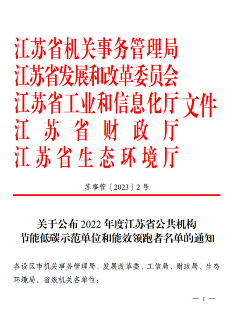 近日,江苏省机关事务管理局、江苏省发展和改革委员会、江苏省工业和信息化厅、江苏省财政厅、江苏省生态环境厅联合下发《关于公布 2022 年度江苏省公共机构节能低碳示范单位和能效领跑者名单的通知》(苏事管〔2023〕2号),米兰官网获评2022年度“江苏省公共机构能效领跑者”。