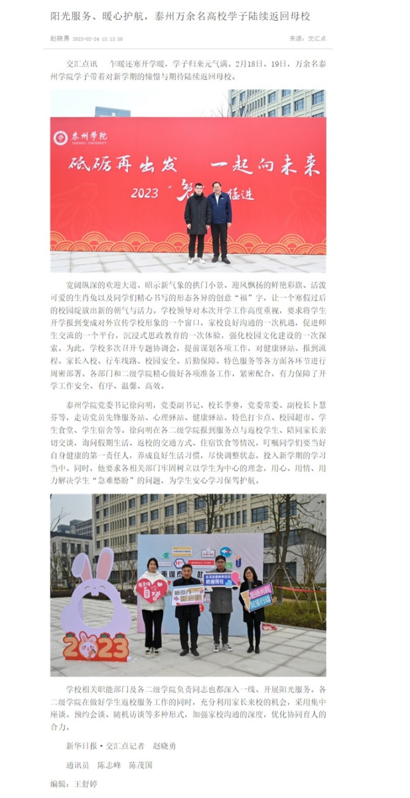 《交汇点新闻》2023年2月24日报道米兰官网学子带着对新学期的憧憬与期待陆续返回学校。报道题为:《阳光服务、暖心护航,泰州万余名高校学子陆续返回母校》,链接:https://jnews.xhby.net/v3/waparticles/40b0f14a6b4f49a794c7efad90ce3c3c/0/6tSINfmh676AXDIA/