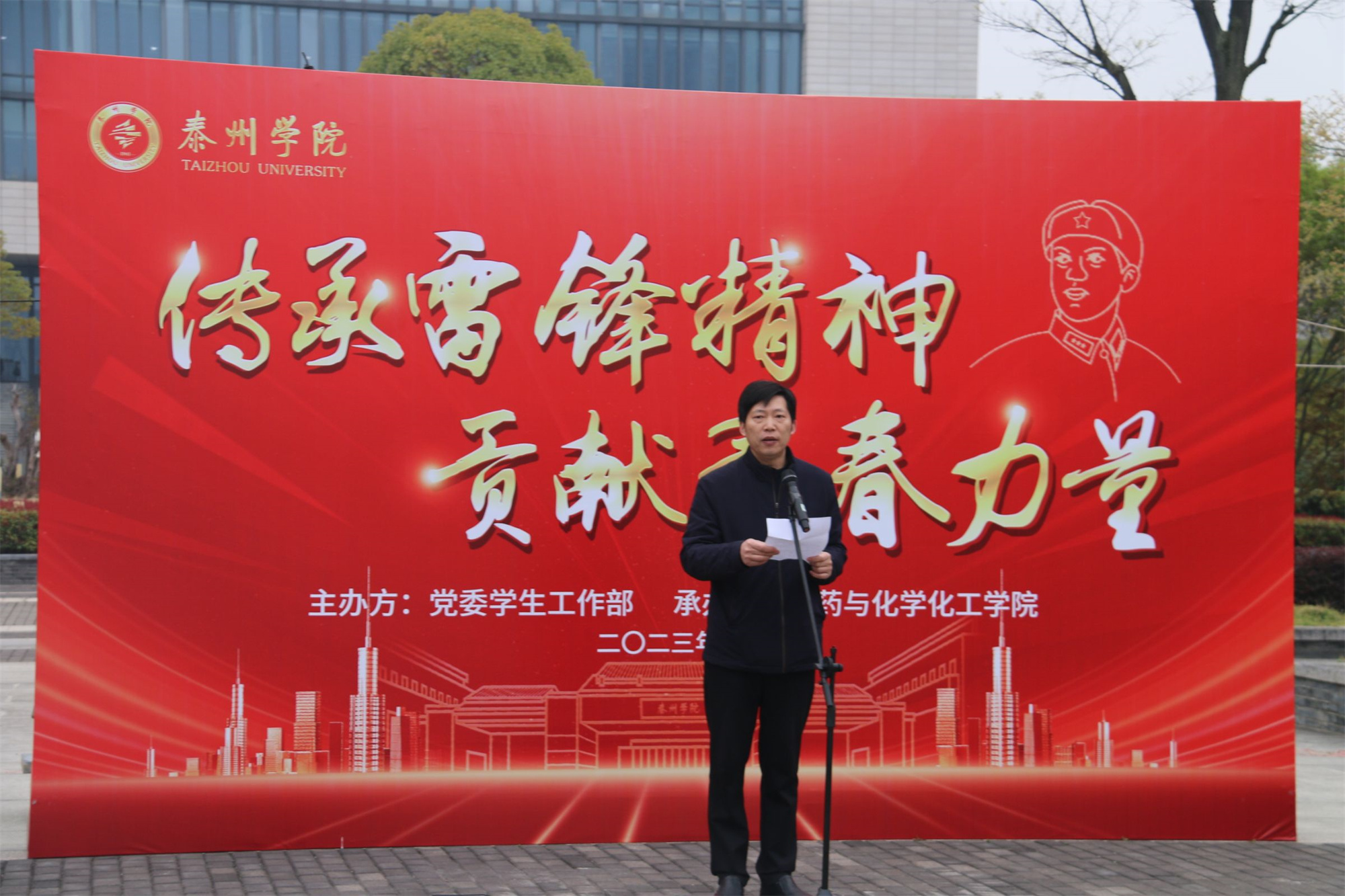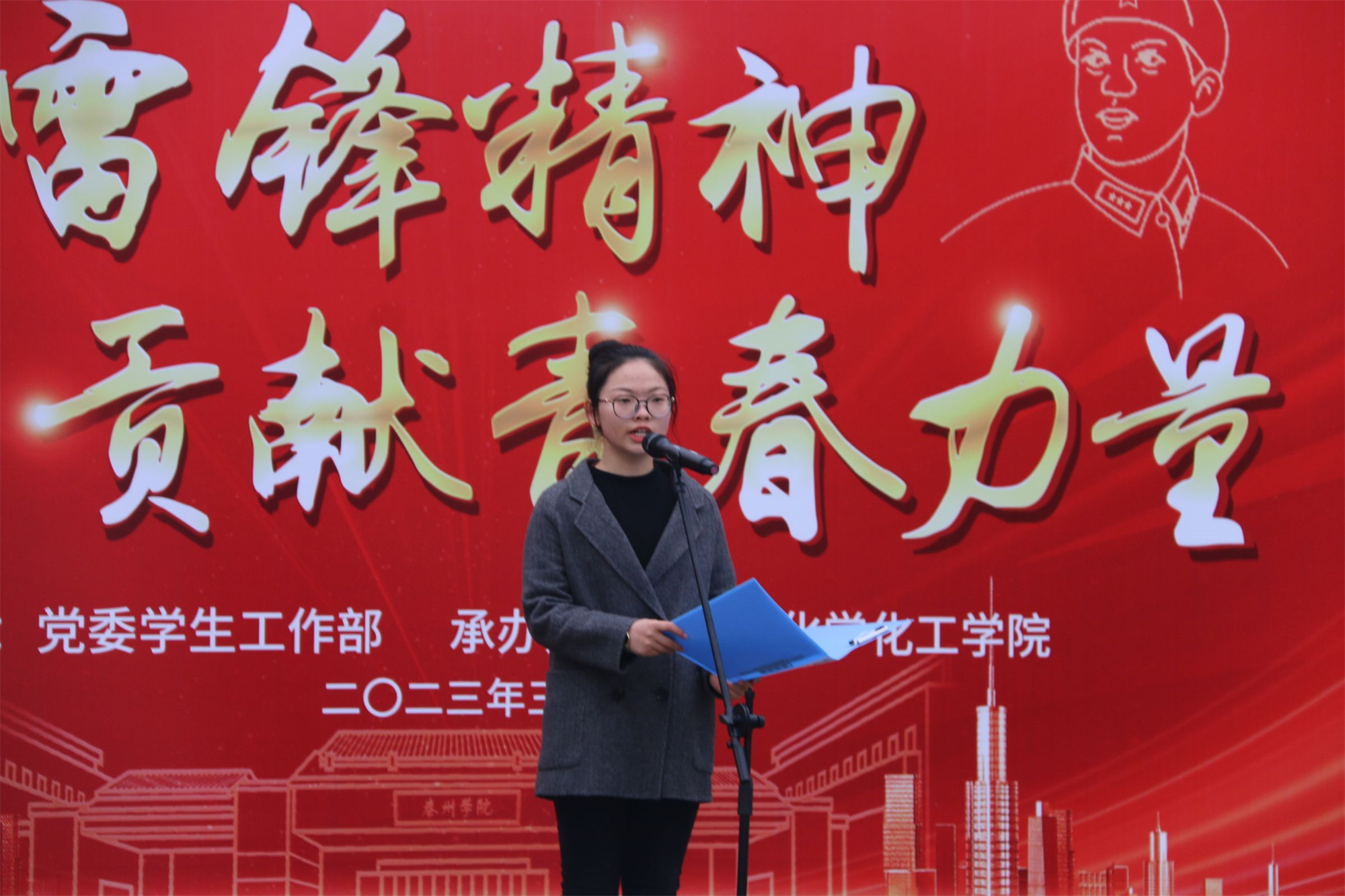 医药与化学化工学院党总支书记徐小兵老师号召老师同学们传承雷锋精神,始终坚定理想信念,学习雷锋忠诚为党的精神;牢固树立奉献品格,学习雷锋敬业奉献的精神,积极投身岗位实践,学习雷锋刻苦钻研的精神。学生代表20制药工程2班陈玥燃同学从新时代大学生学习生活的角度,号召大家牢记“敦尚行实、明体达用”的校训,让学雷锋活动融入日常、化作经常,将个人的理想追求融入到实现中国梦的新征程中。