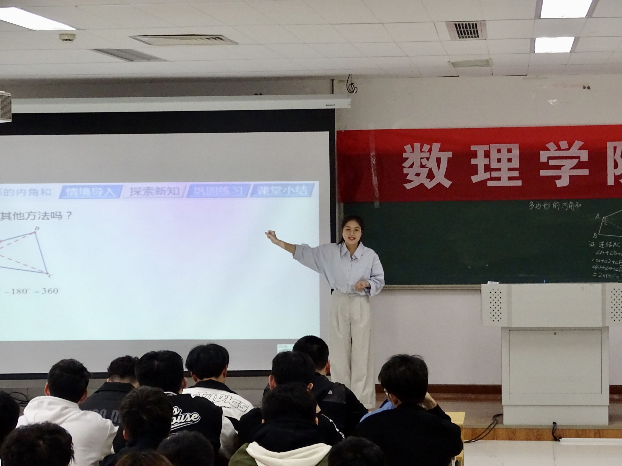 讲座开始,吕老师就初中数学教材中《线段、角的对称性》教学内容,运用类比的思想,为大家进行了片段教学讲解示范。吕校长的讲授教学情境创设独特,新知形成过程新颖,对教学重难点把握精准,他苍劲有力的板书、自然亲切的教态都给同学们以良好的示范。在学生代表片段教学环节中,19级数师3班的石雨婷同学讲解了《多边形的内角和》,石雨婷通过抛出问题、巧设活动情景来导入新课,流畅的授课过程与层次分明的教学结构有效训练了同学们由简单到复杂的思维;20级数师4班的苏飞诚通过将具体实例对比归纳的方法讲述了一次函数的相关内容,其教学实施过程切合知识的形成过程;20级数师3班的杨彩霞通过绘制函数图像、讲解例题的方法介绍《二次函数和一元二次方程》,她的讲解过程清晰、语言准确精炼。在点评环节中,吕老师首先着重强调了编制考试中面试环节的重要性,随后结合自身教学经验对三位同学的教学提出建议。吕校长提醒同学们要通过知识的储备、案例的准备、基本功的训练与心理的准备四个方面使自己的教学更加出彩。讲座最后,刘来山老师对本次活动进行了总结,提醒同学们要抓住知识的本质、强化基本功,为未来发展做好准备。
