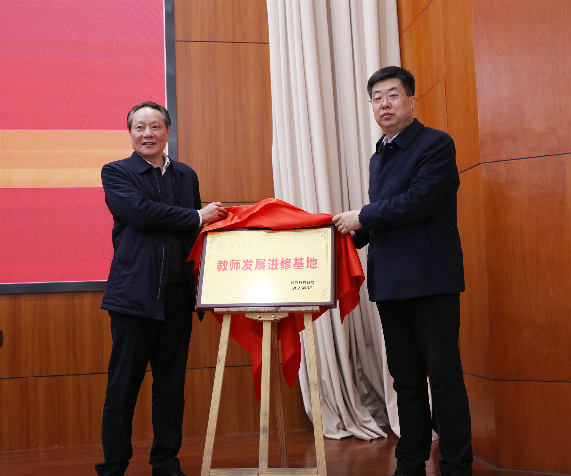 文志军与钱忠相共同为长武县教育局教师发展研修基地揭牌。