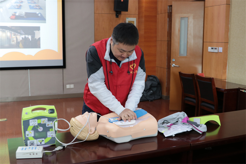 后勤管理处处长蒋成忠代表学校与泰州市疾控中心签订《泰州市公共场所自动体外除颤器(AED)投放项目合作协议书》。签约仪式后,急救中心培训老师先对大家进行急救技能普及培训,着重讲解心肺复苏的操作流程并现场指导参培人员进行心肺复苏实操训练。随后,工程师就AED设备使用流程、注意事项等进行讲解并现场示范,在他的专业指导下,部分参培人员沉浸式体验AED的操作要点。活动结束后,工程师来到宿舍楼B栋宿管站安装AED设备。