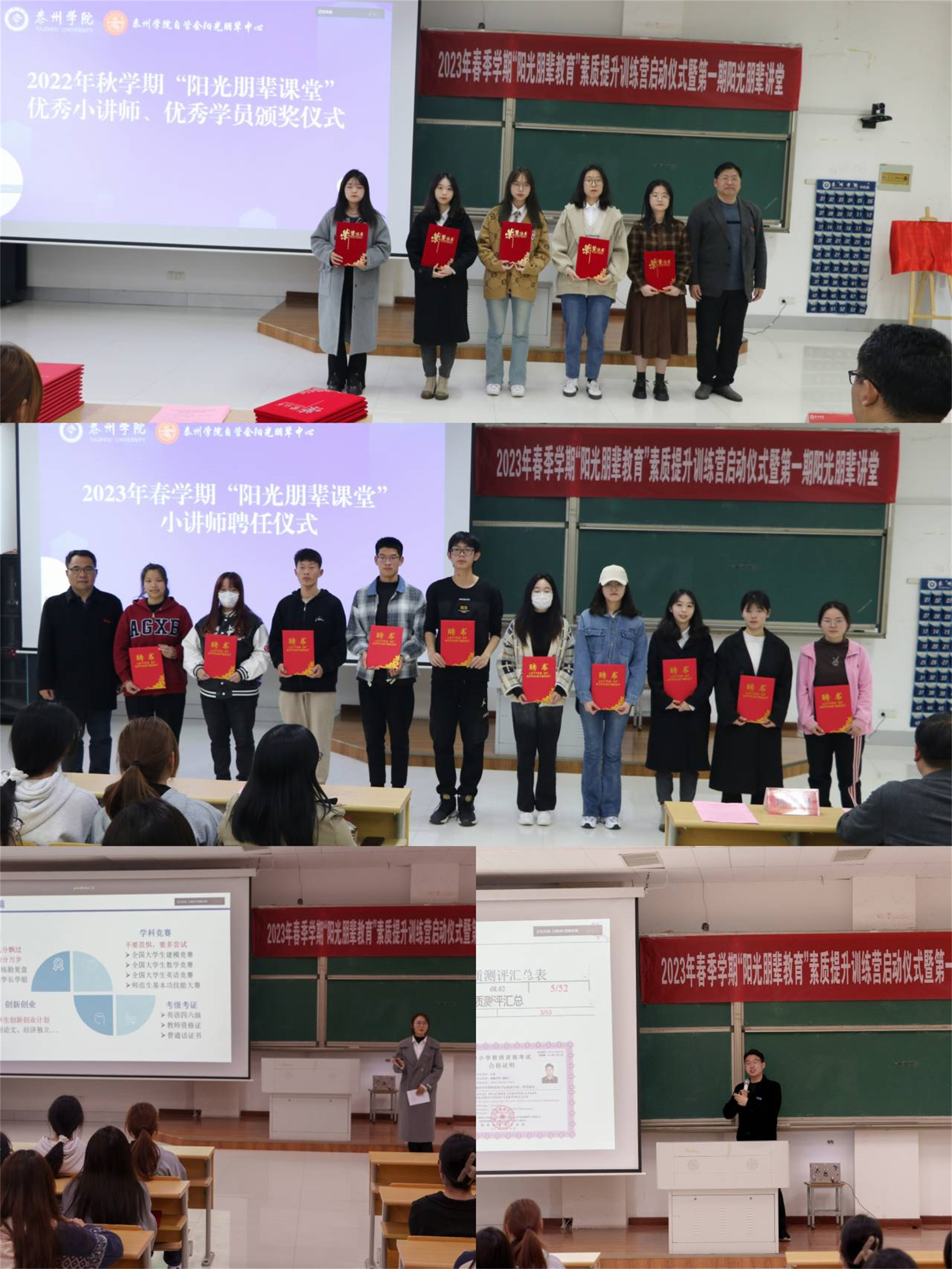 活动中,官小燕对“阳光朋辈教育”项目进行了介绍,陈志峰宣读了2022年秋学期“阳光朋辈课堂”优秀小讲师和优秀学员名单。潘小明和陈茂国为优秀小讲师和优秀学员颁发了荣誉证书和聘书,并共同为2023年春季学期“阳光朋辈教育”素质提升训练营揭幕。来自数理学院的吴敏和LETOU国际米兰官网的顾文诚两位同学,作为“阳光朋辈讲堂”第一期的主讲人,分享了他们的大学生活和考编经验,并就“如何做到不玩手机”“如何保持良好心态”“校招和社招的区别”等现实问题进行现场互动,气氛欢快热烈。