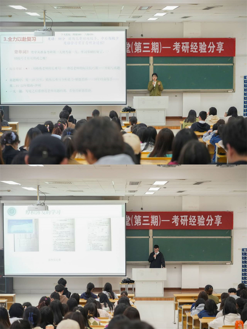活动中,刘雨以“道阻且长 行则将至”为主题,从明确人生方向、搜集相关信息、全力以赴复习、想说的一些话四个方面分享自己的大学生活、学习和考研经验。孙东亮以“勤勉笃行 志存高远”为主题,从多姿多彩的生活、厚积薄发的学习、笃行不怠的实践、驰而不息的研路四个方面介绍自己的成长历程和成功经验。两位同学从考研的网络资源、书本资料、时间安排、题型分析、初试复试的出题思路、心态调整等方面为学弟学妹们开拓了思路,提供了方法,坚定了信心。
