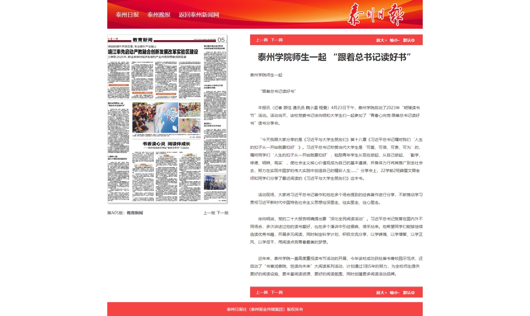 《泰州日报》A05版4月26日报道米兰官网启动2023年“胡瑗读书节”活动。活动当天,党委书记徐向明和大学生们一起参加了“青春心向党·跟着总书记读好书”读书分享会。报道题为:《LETOU国际米兰官网师生一起 “跟着总书记读好书”》,链接为:http://sz.tznews.cn/tzrb/pc/col/202304/26/content_200772.html
